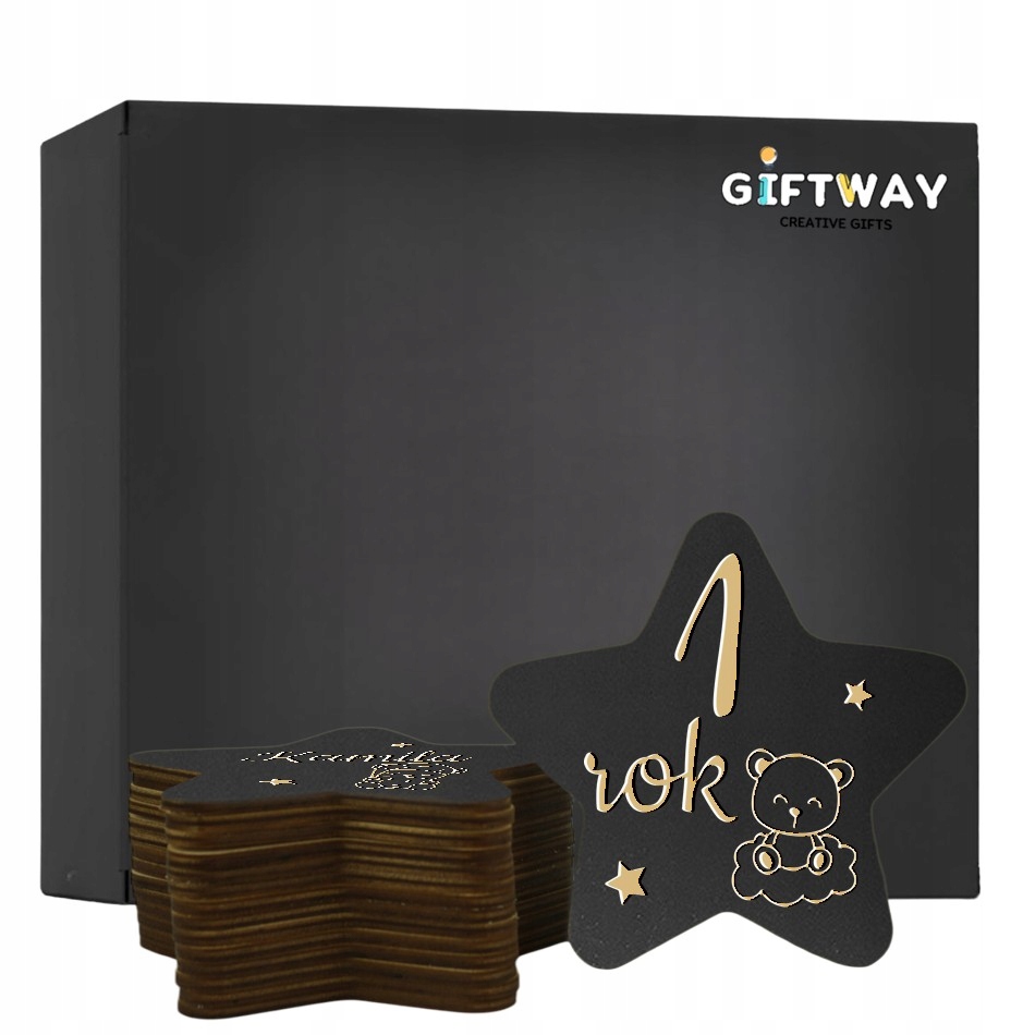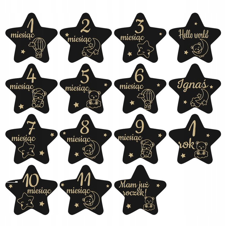 Drewniane Tabliczki do Zdjęć – Pierwszy Rok Życia Dziecka 15 szt. – Gwiazdki z misiami (czarne)