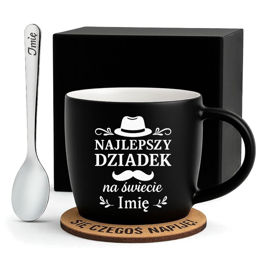 Kubek Personalizowany z Imieniem Czarny + Łyżeczka i Podkładka Zestaw dla Dziadka v.1