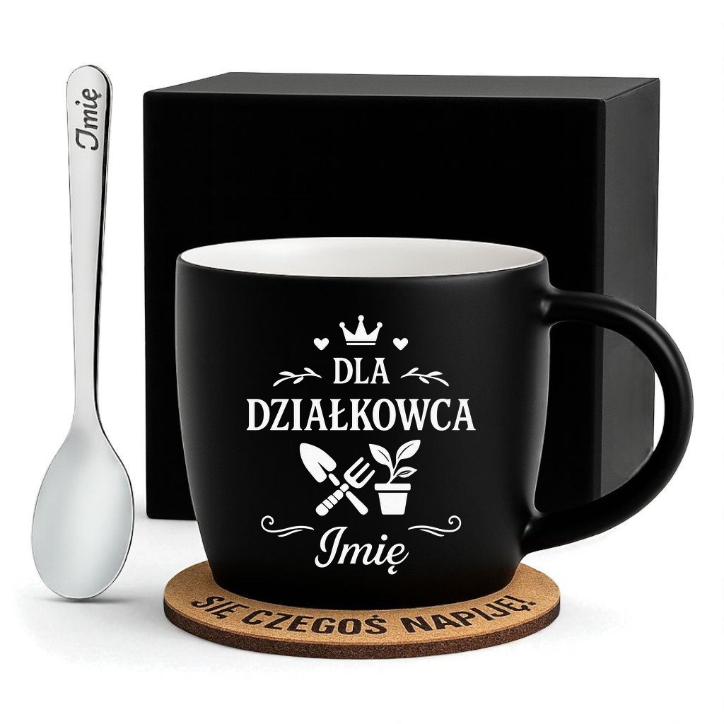 Kubek Personalizowany z Imieniem Czarny + Łyżeczka i Podkładka Zestaw dla Działkowca v.1