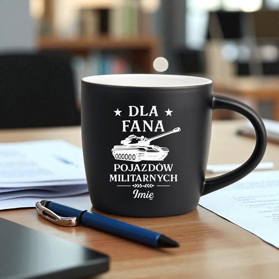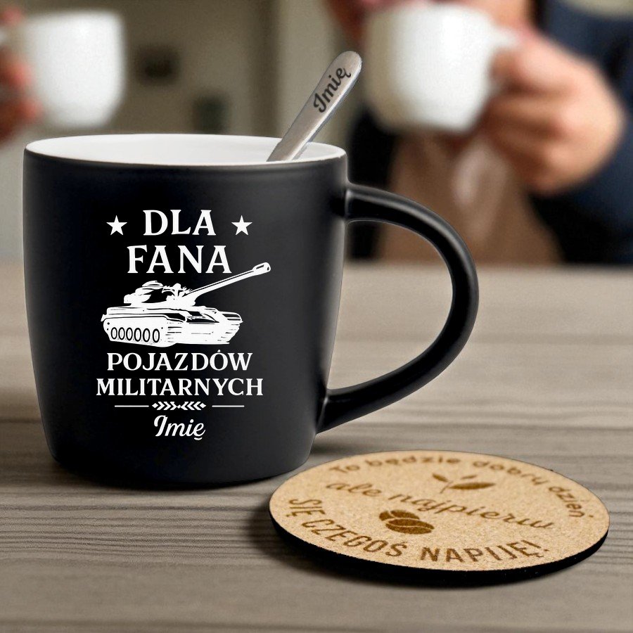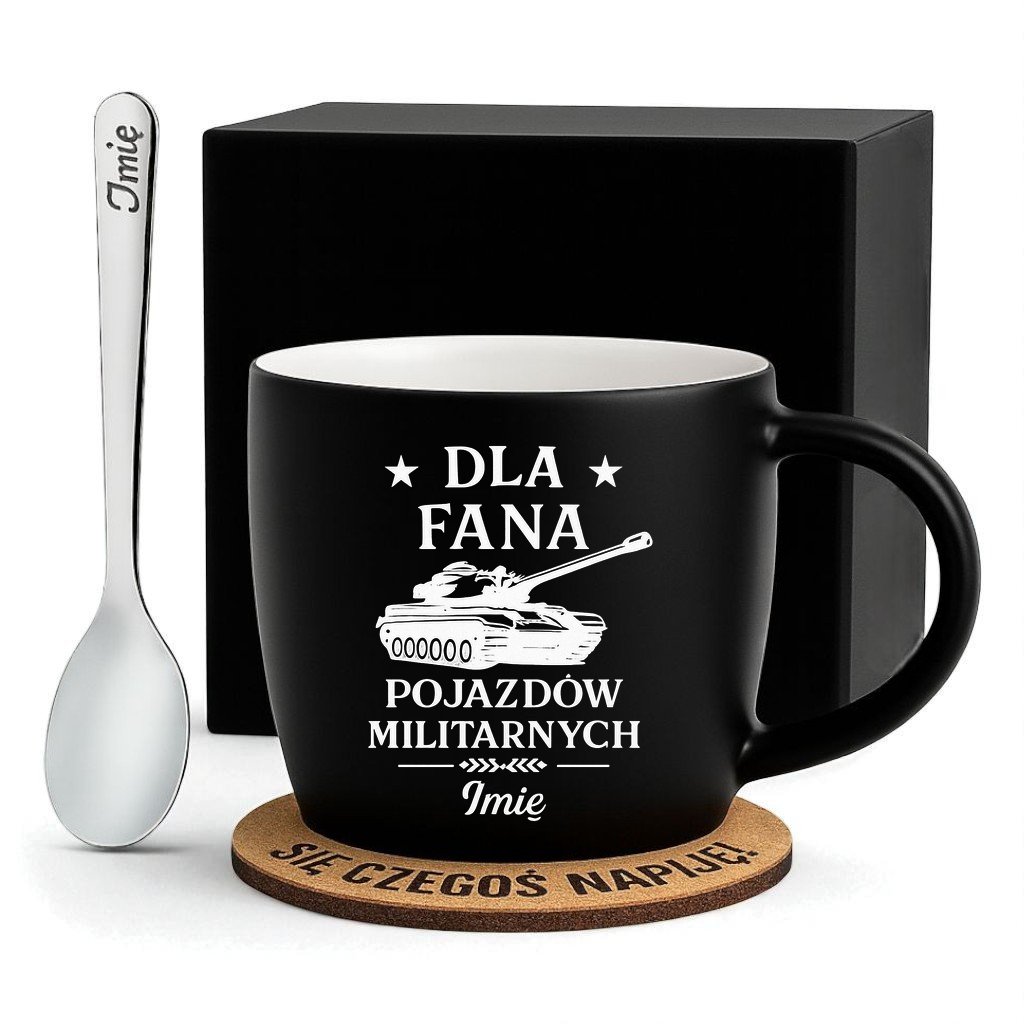 Kubek Personalizowany z Imieniem Czarny + Łyżeczka i Podkładka Zestaw dla Fana Pojazdów Militarnych v.1