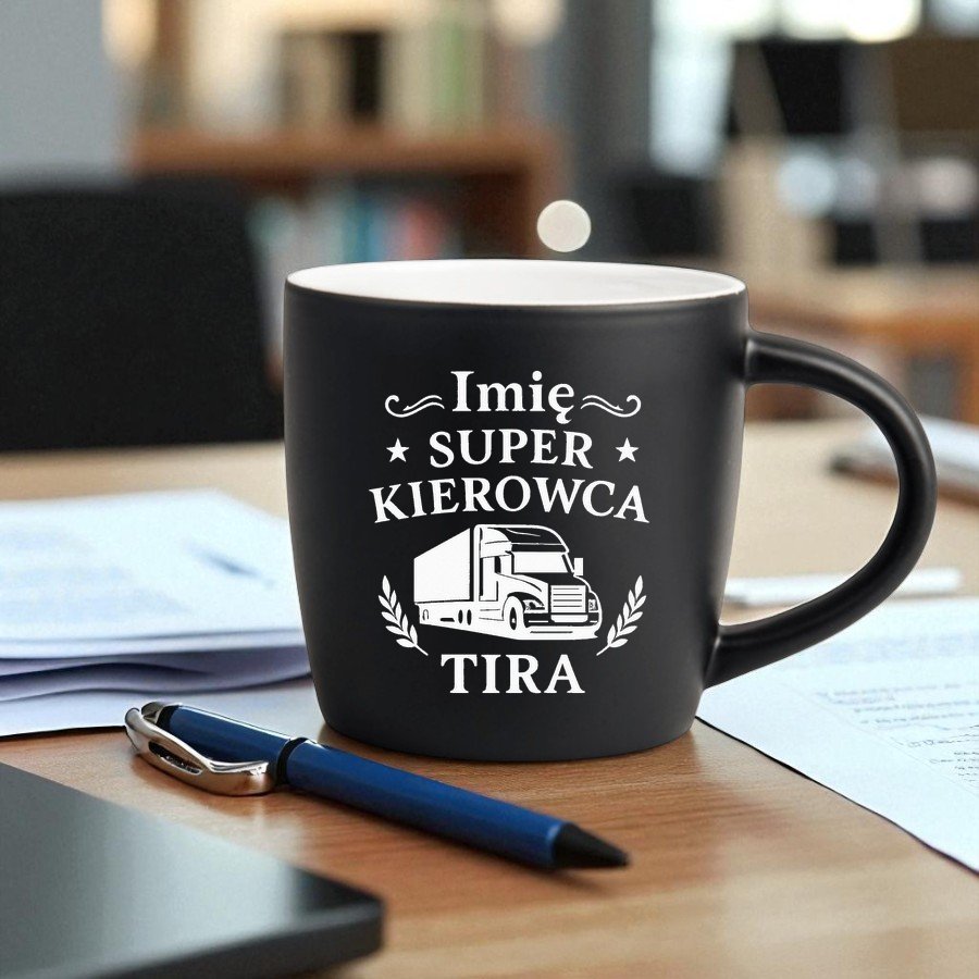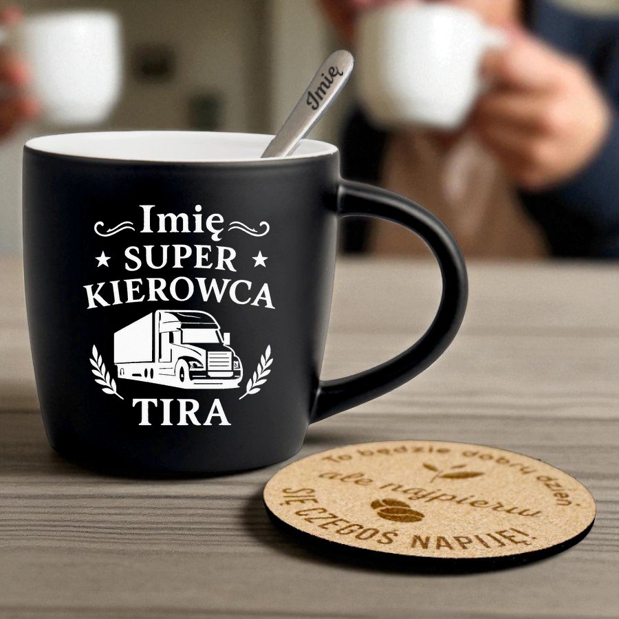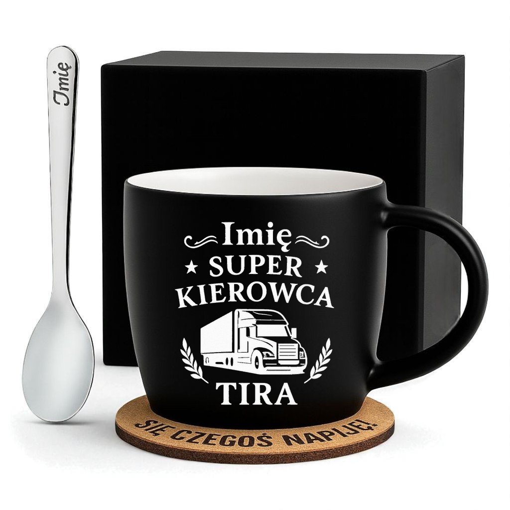 Kubek Personalizowany z Imieniem Czarny + Łyżeczka i Podkładka Zestaw dla kierowcy Tira v.2