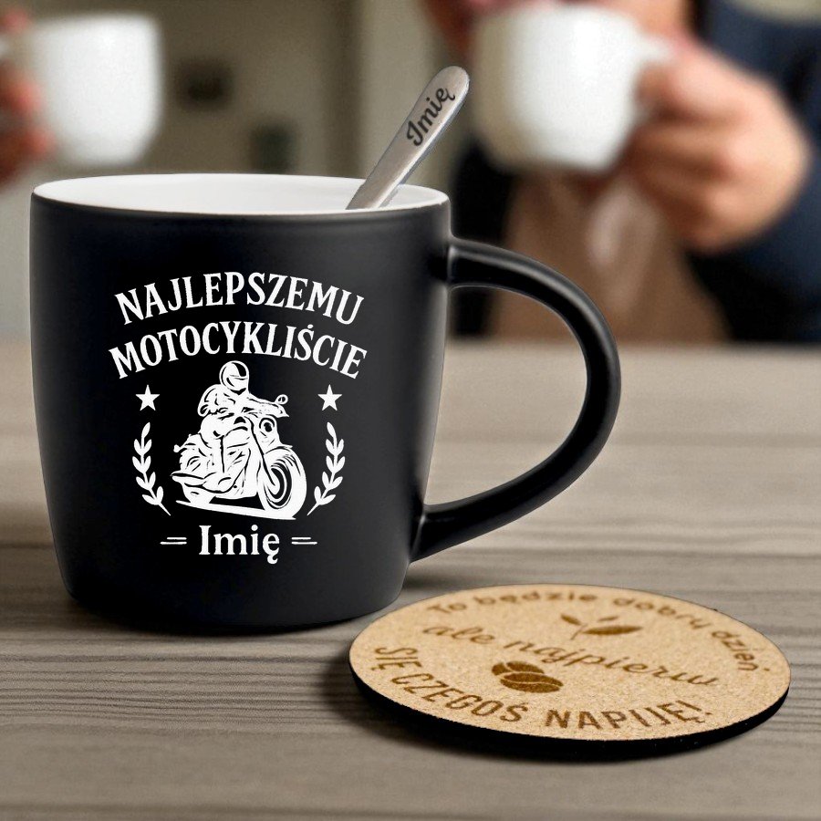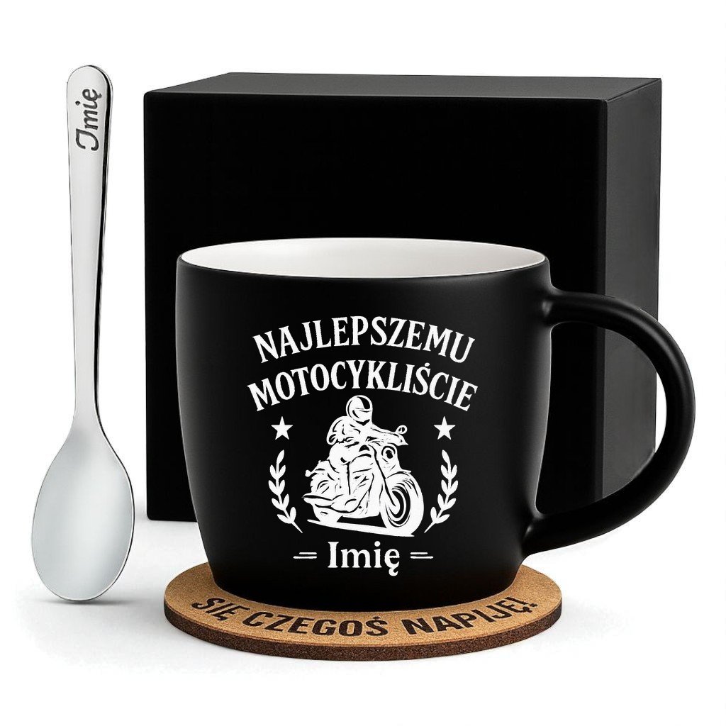 Kubek Personalizowany z Imieniem Czarny + Łyżeczka i Podkładka Zestaw dla Motocyklisty v.1