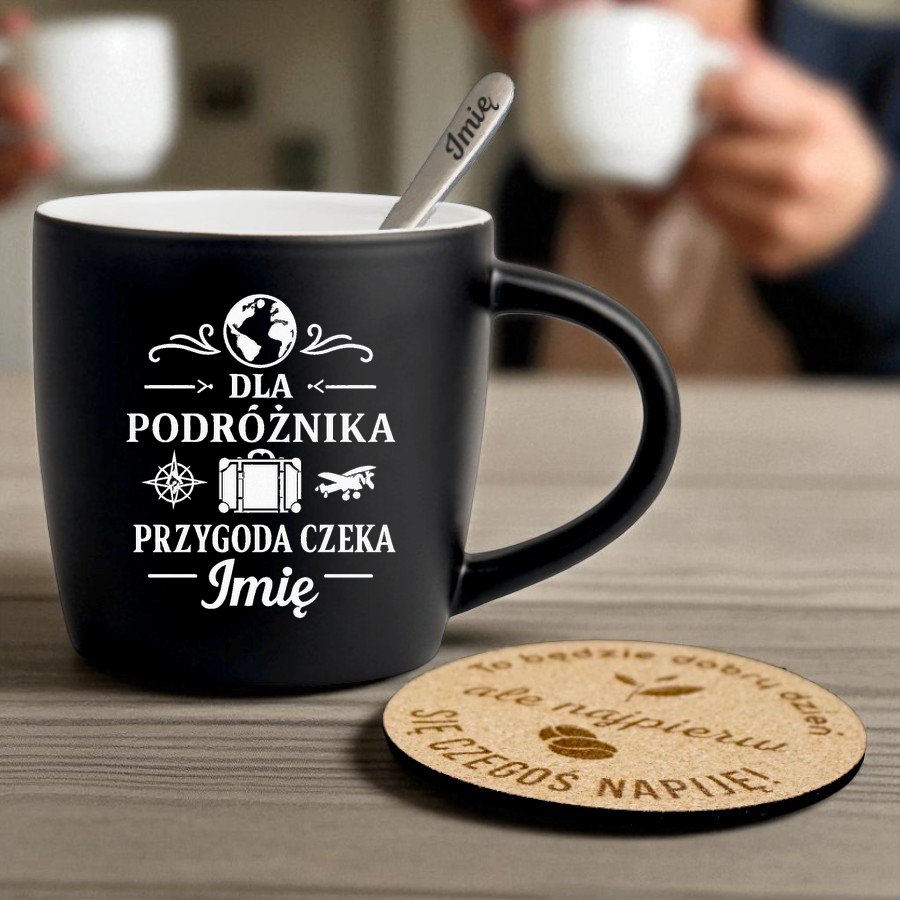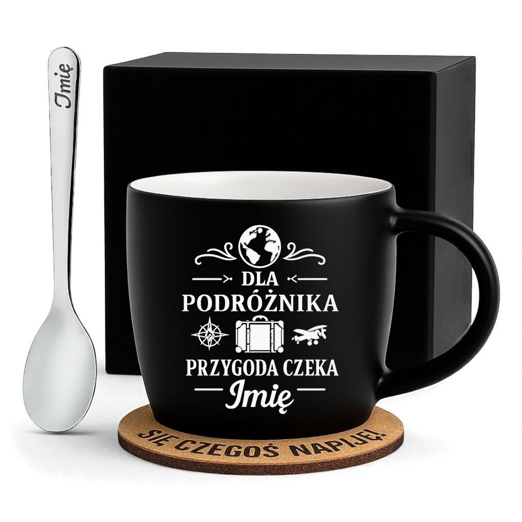 Kubek Personalizowany z Imieniem Czarny + Łyżeczka i Podkładka Zestaw dla Podróżnika v.1