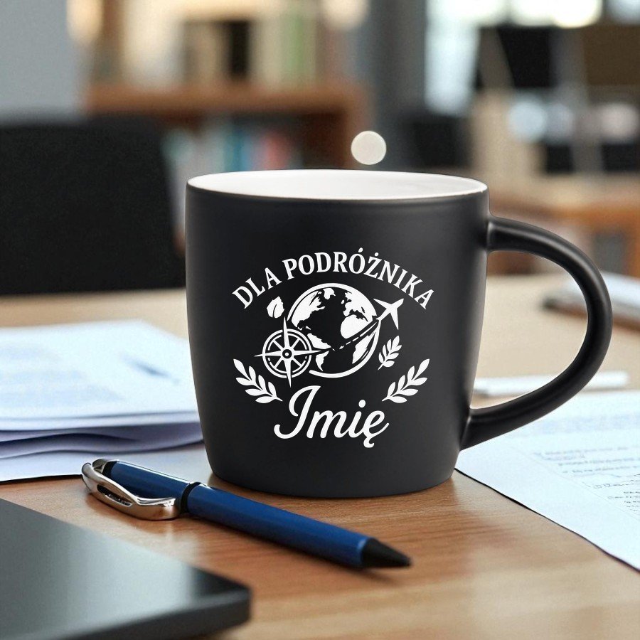 Kubek Personalizowany z Imieniem Czarny + Łyżeczka i Podkładka Zestaw dla Podróżnika v.2