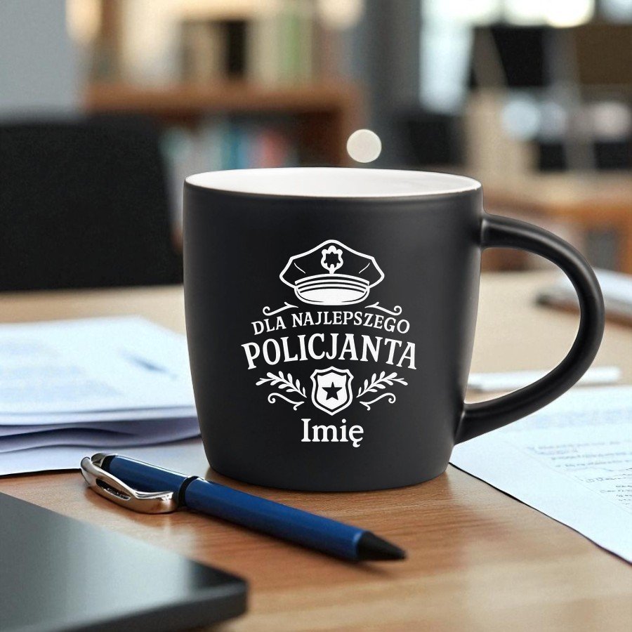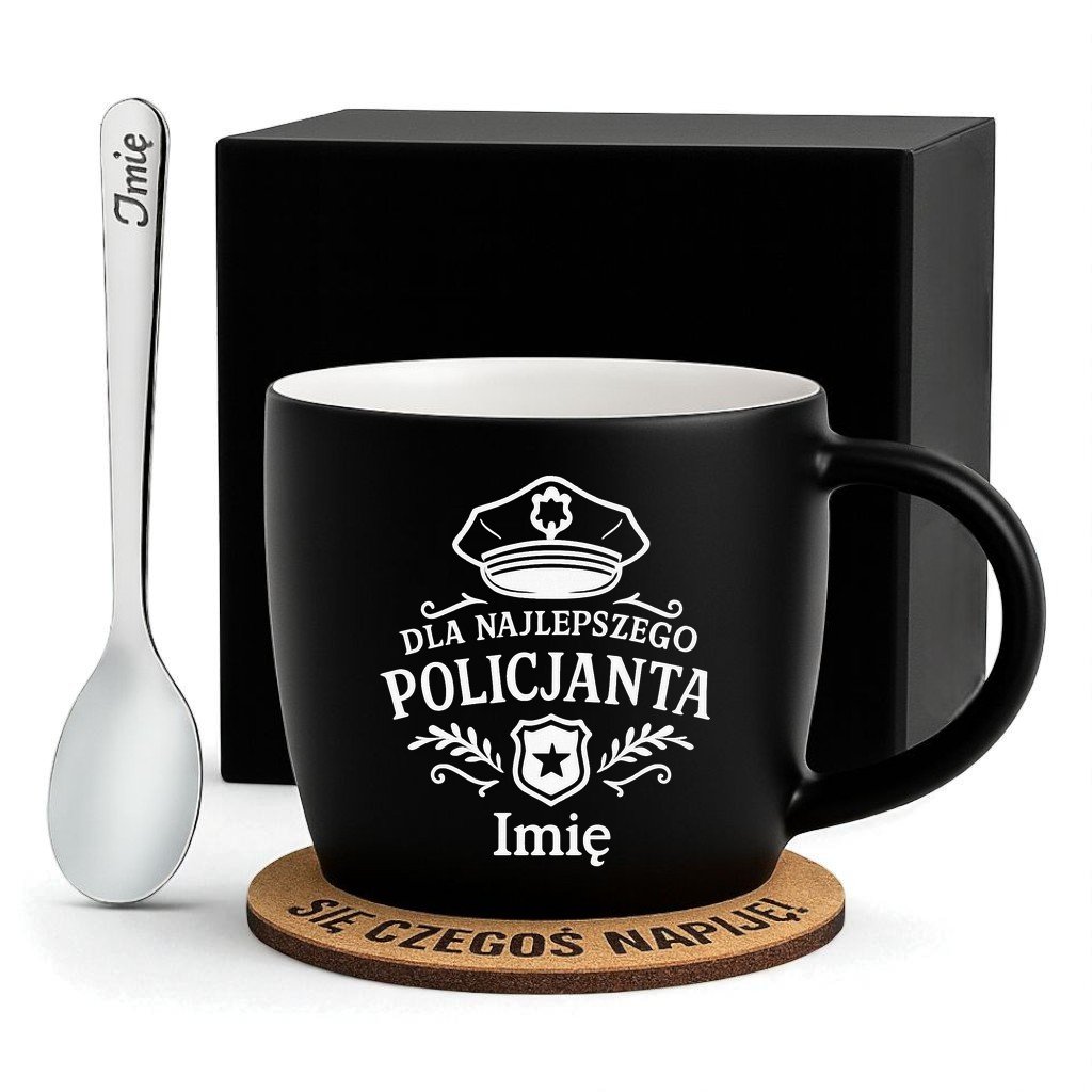 Kubek Personalizowany z Imieniem Czarny + Łyżeczka i Podkładka Zestaw dla Policjanta v.2