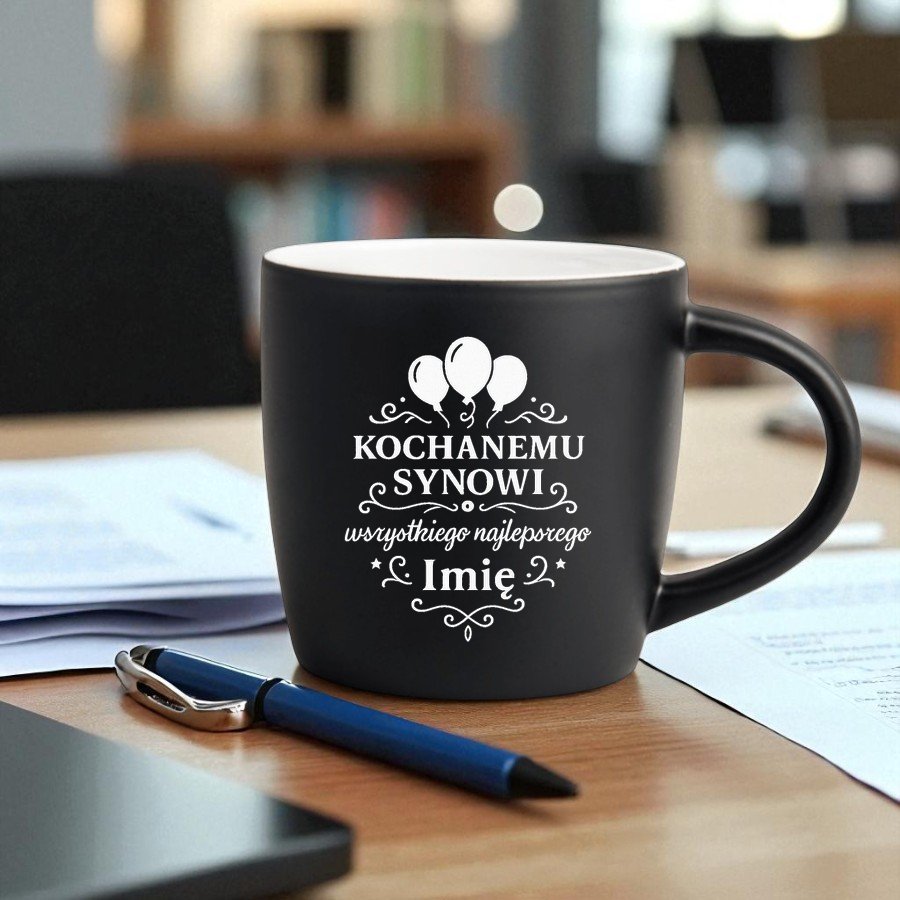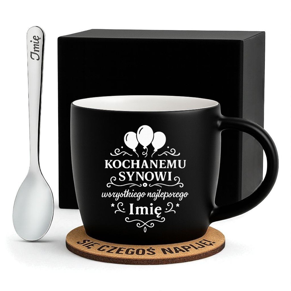 Kubek Personalizowany z Imieniem Czarny + Łyżeczka i Podkładka Zestaw dla Syna v.1
