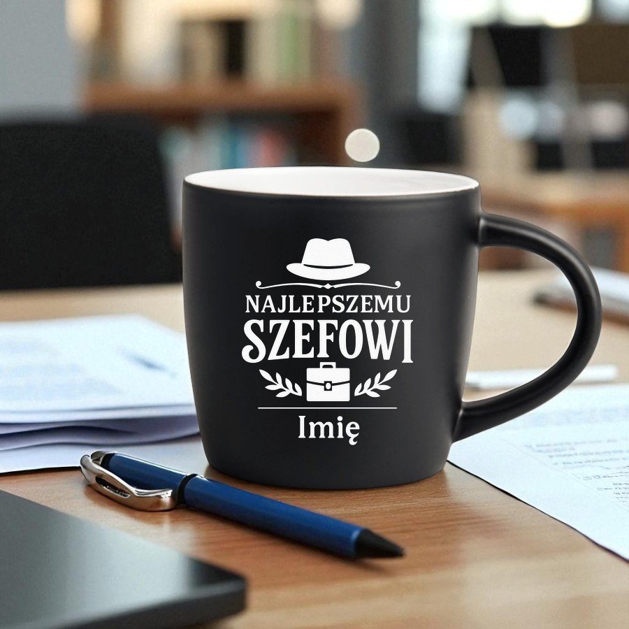 Kubek Personalizowany z Imieniem Czarny + Łyżeczka i Podkładka Zestaw dla Szefa v.1