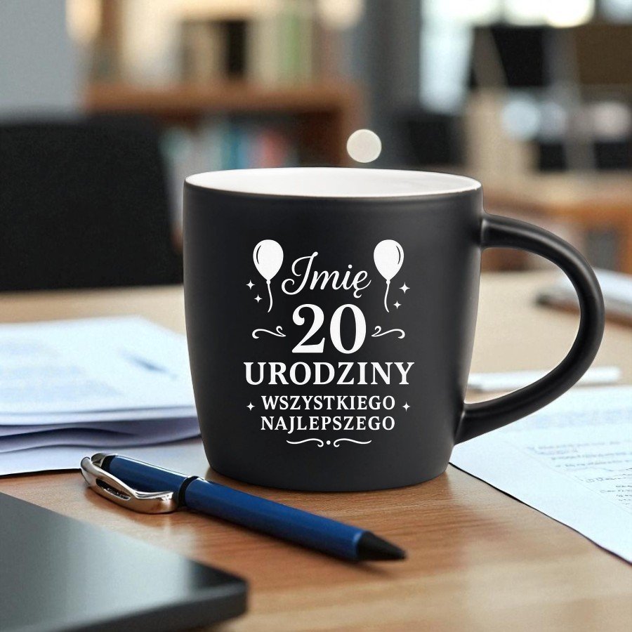 Kubek Personalizowany z Imieniem Czarny + Łyżeczka i Podkładka Zestaw na 20 Urodziny v.4