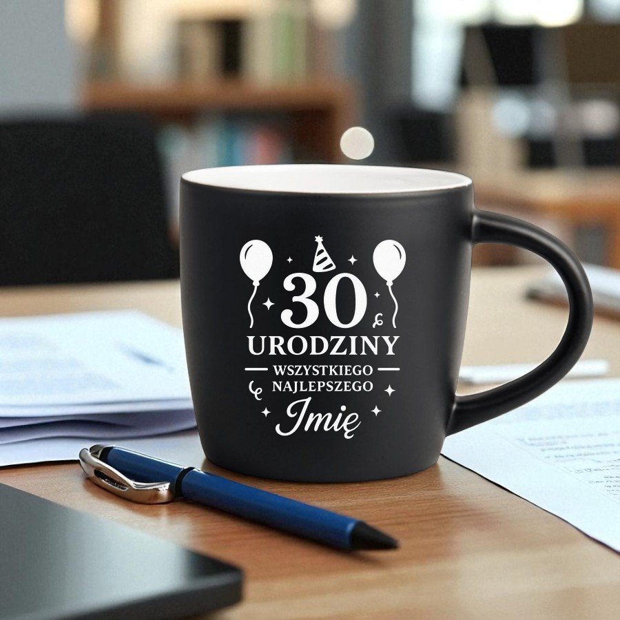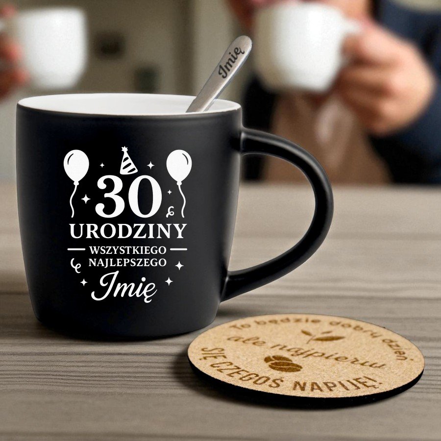 Kubek Personalizowany z Imieniem Czarny + Łyżeczka i Podkładka Zestaw na 30 urodziny v.3
