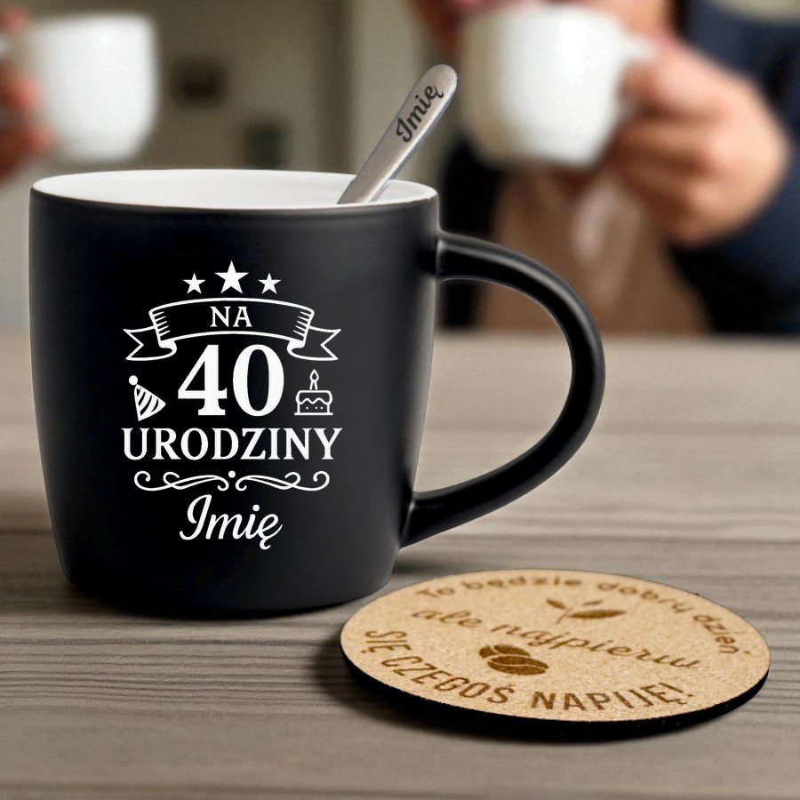 Kubek Personalizowany z Imieniem Czarny + Łyżeczka i Podkładka Zestaw na 40 urodziny v.2