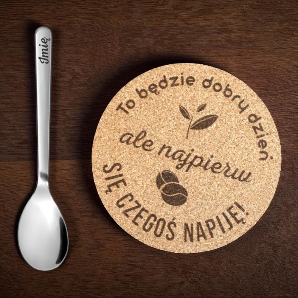 - Podkładka korkowa: grubość: 3mm, średnica 100mm, napis: „To będzie dobry dzień..”