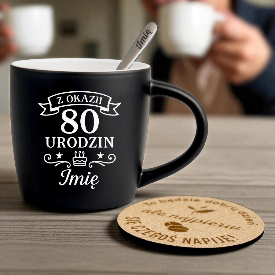 Kubek Personalizowany z Imieniem Czarny + Łyżeczka i Podkładka Zestaw na 80 urodziny v.1