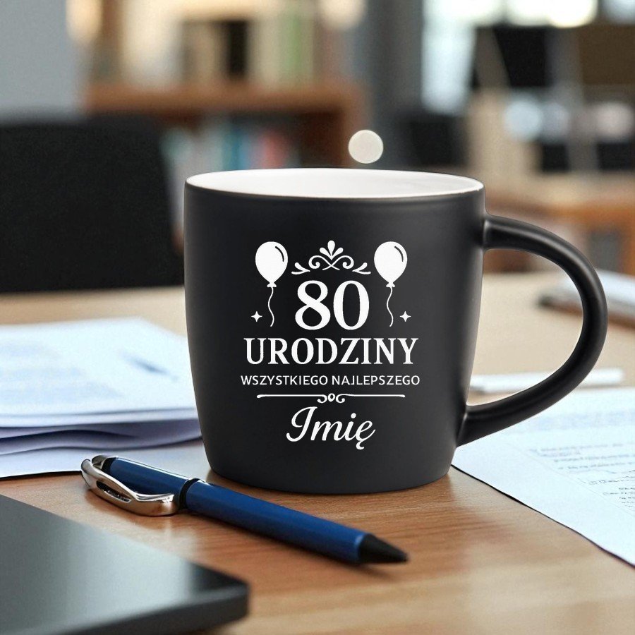 Kubek Personalizowany z Imieniem Czarny + Łyżeczka i Podkładka Zestaw na 80 urodziny v.3