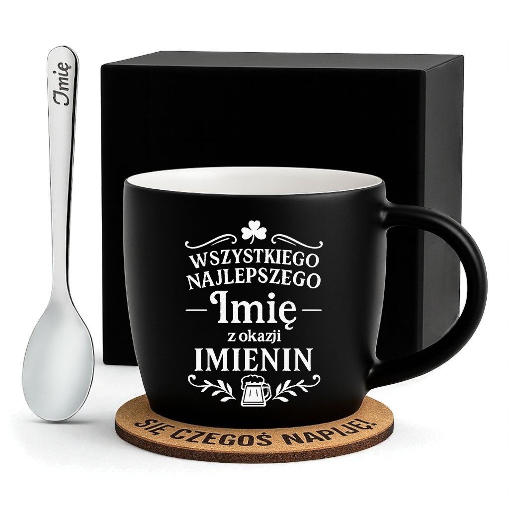 Kubek Personalizowany z Imieniem Czarny + Łyżeczka i Podkładka Zestaw na Imieniny v.2