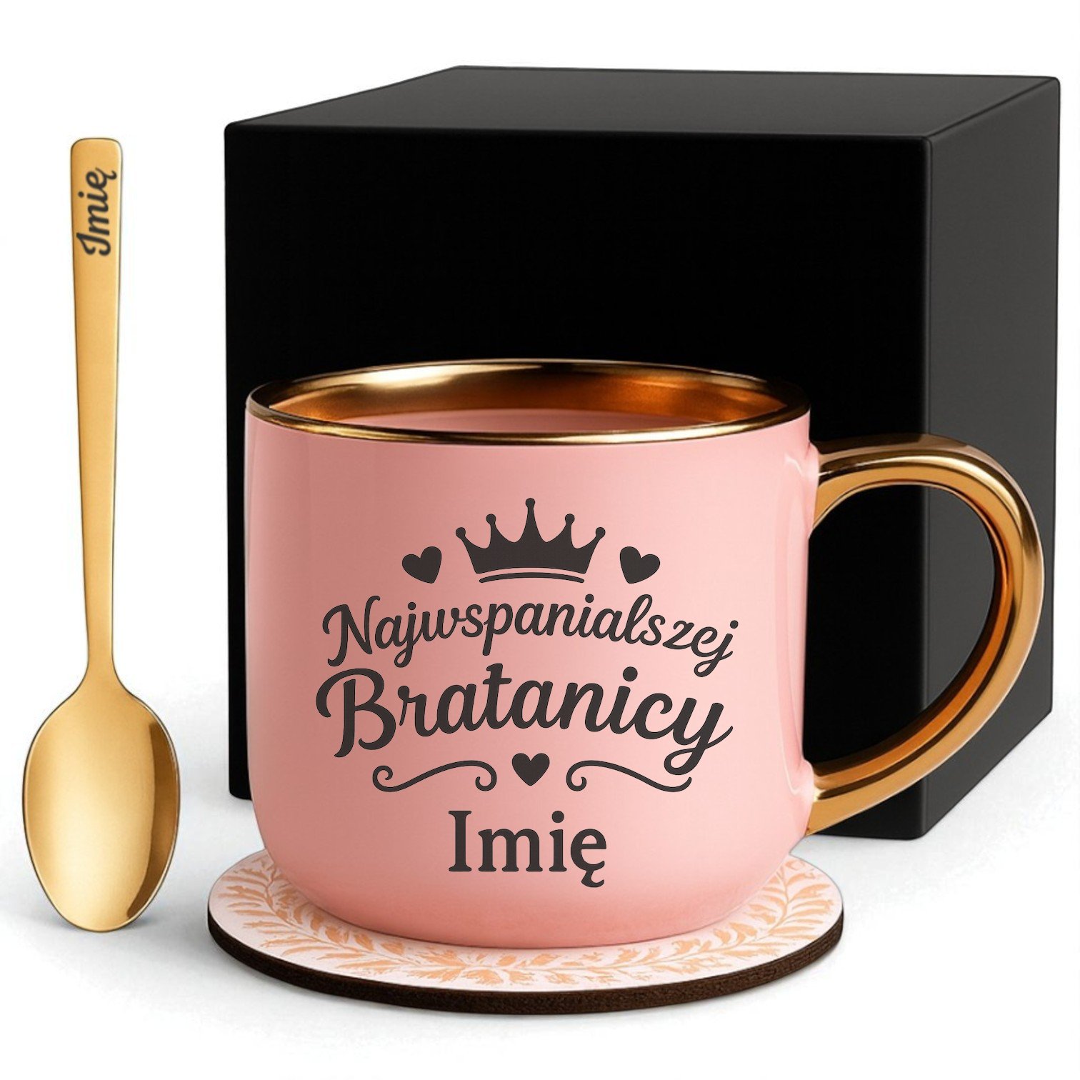 Kubek Personalizowany z Imieniem Róż + Łyżeczka i Podstawka Zestaw dla Bratanicy v.1