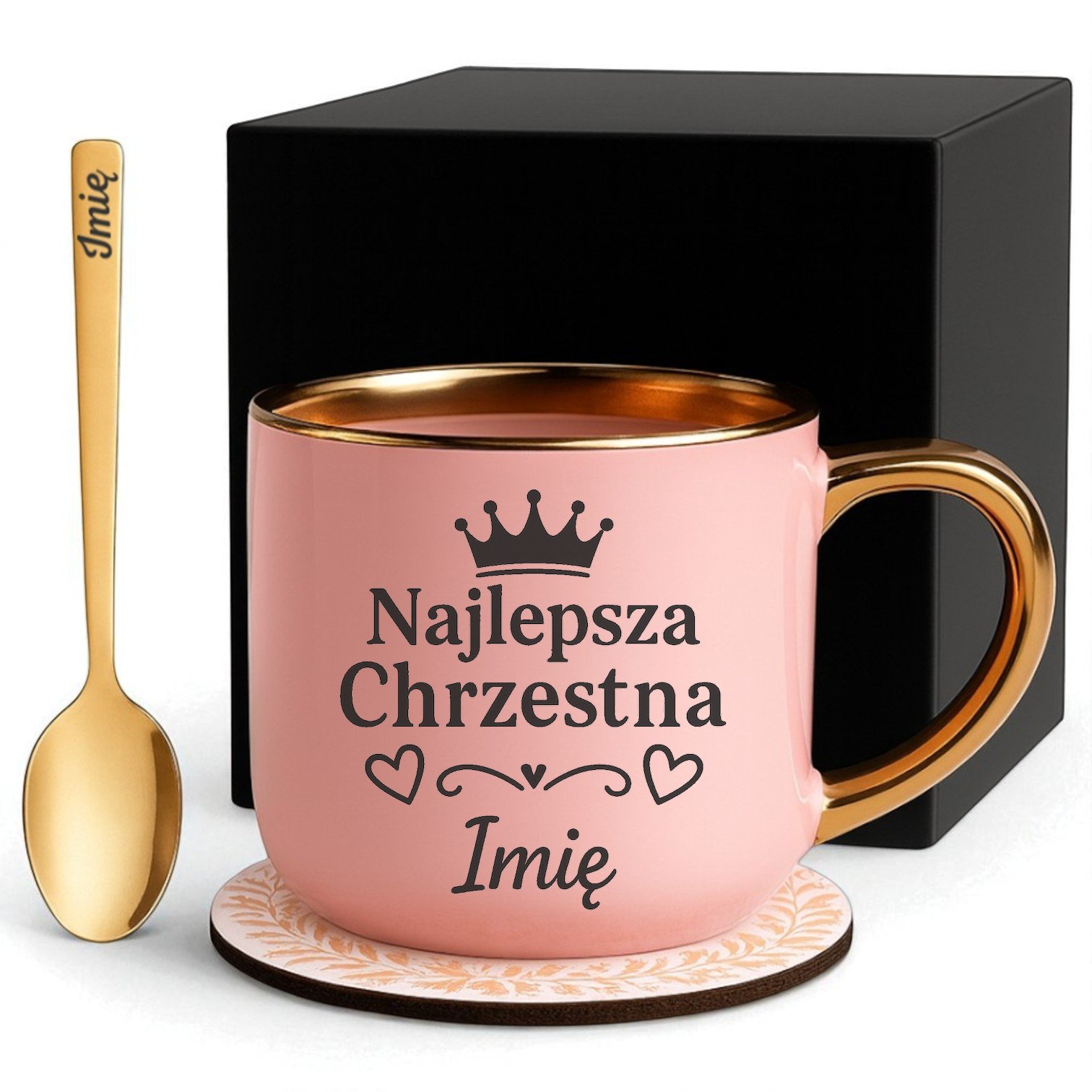 Wpisz imię (w odmienionej wedle uznania formie) podczas składania zamówienia – umieścimy je na kubku w wybranym wzorze (estetyczny, czytelny układ), a także wygrawerujemy to samo imię na złotej łyżeczce.