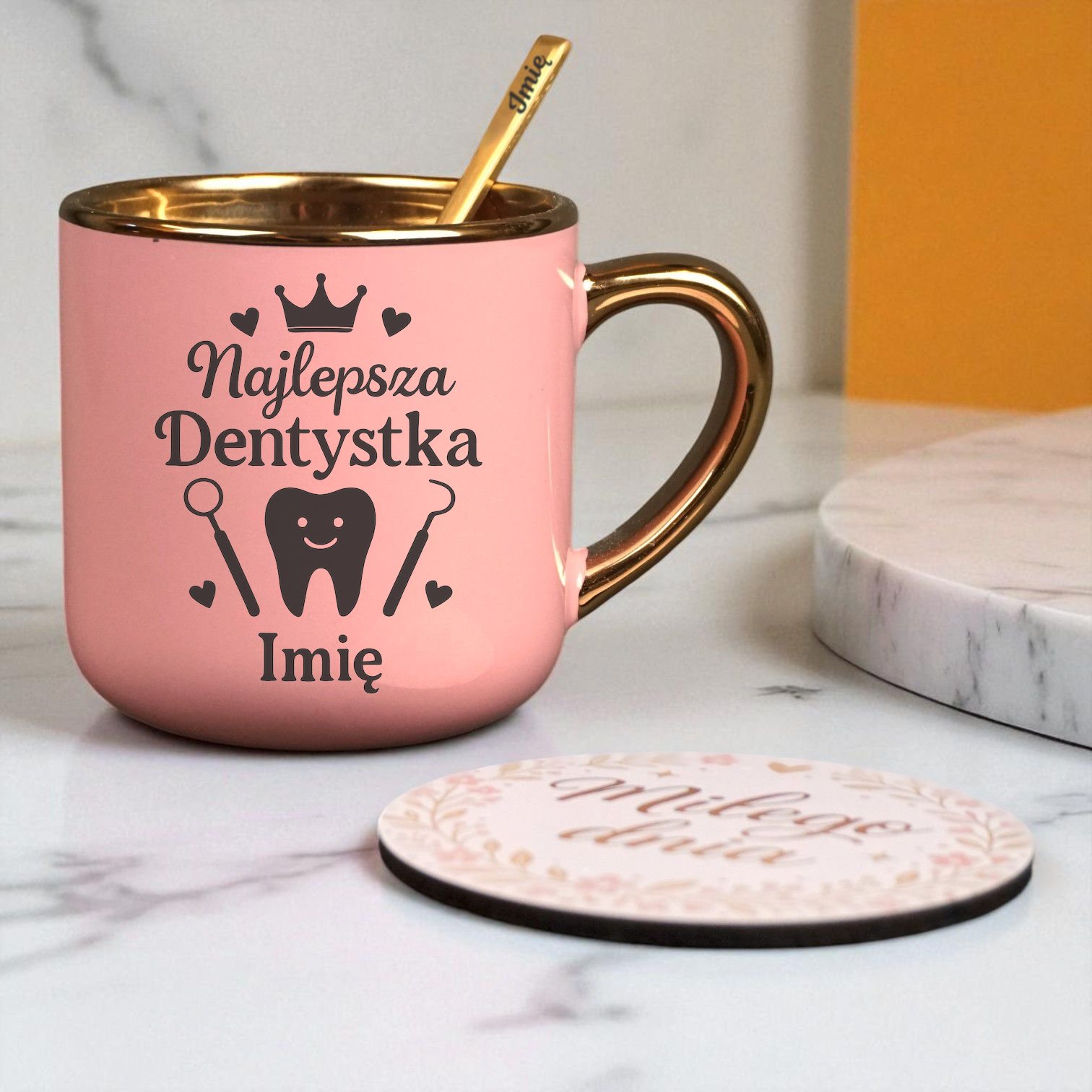 Kubek Personalizowany z Imieniem Róż + Łyżeczka i Podstawka Zestaw dla Dentystki v.2