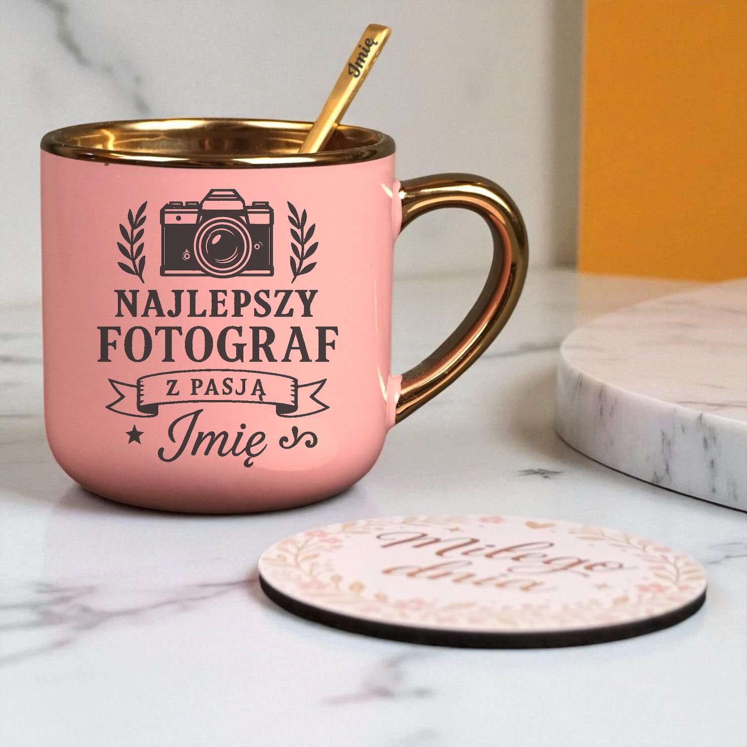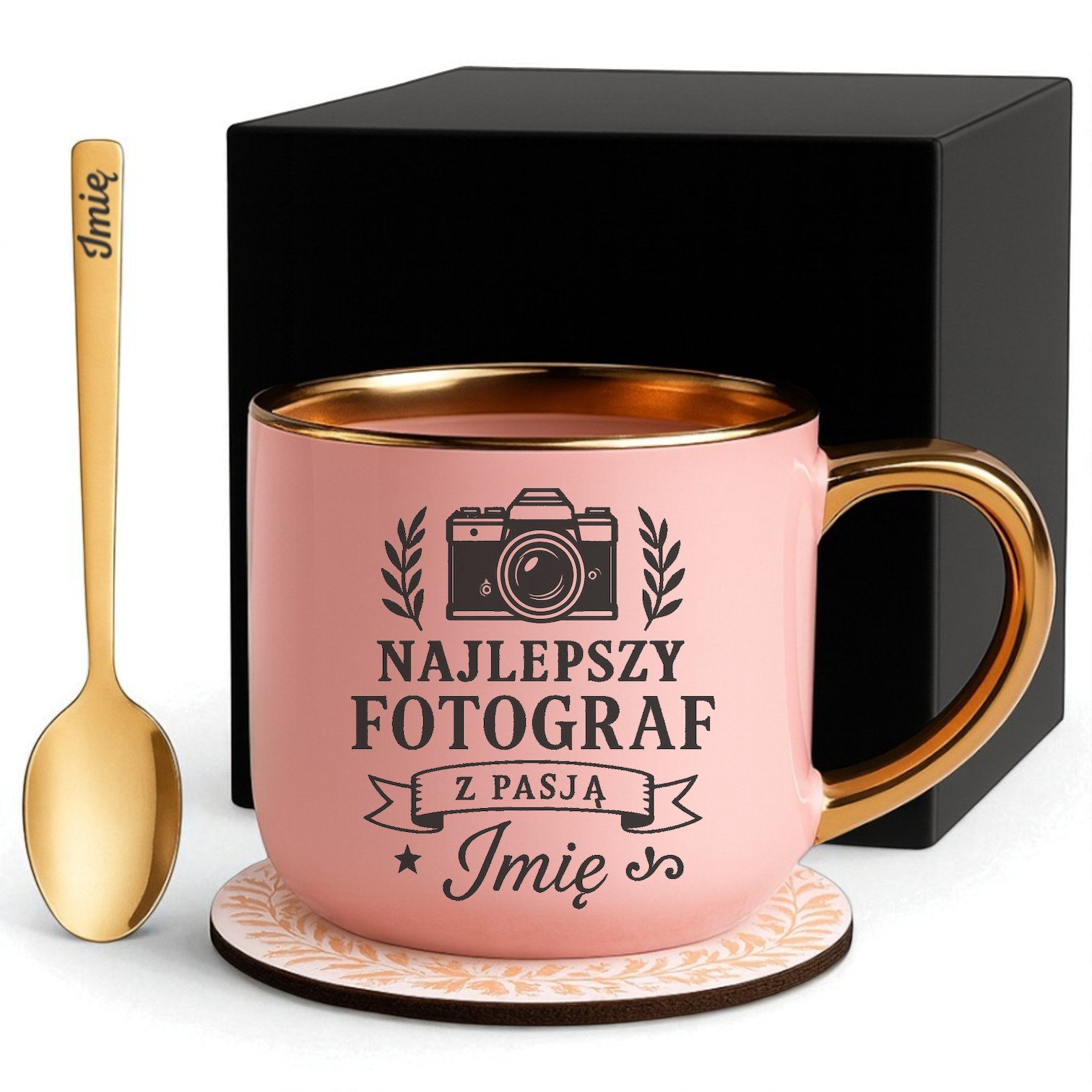 Kubek Personalizowany z Imieniem Róż + Łyżeczka i Podstawka Zestaw dla Fotografa v.1