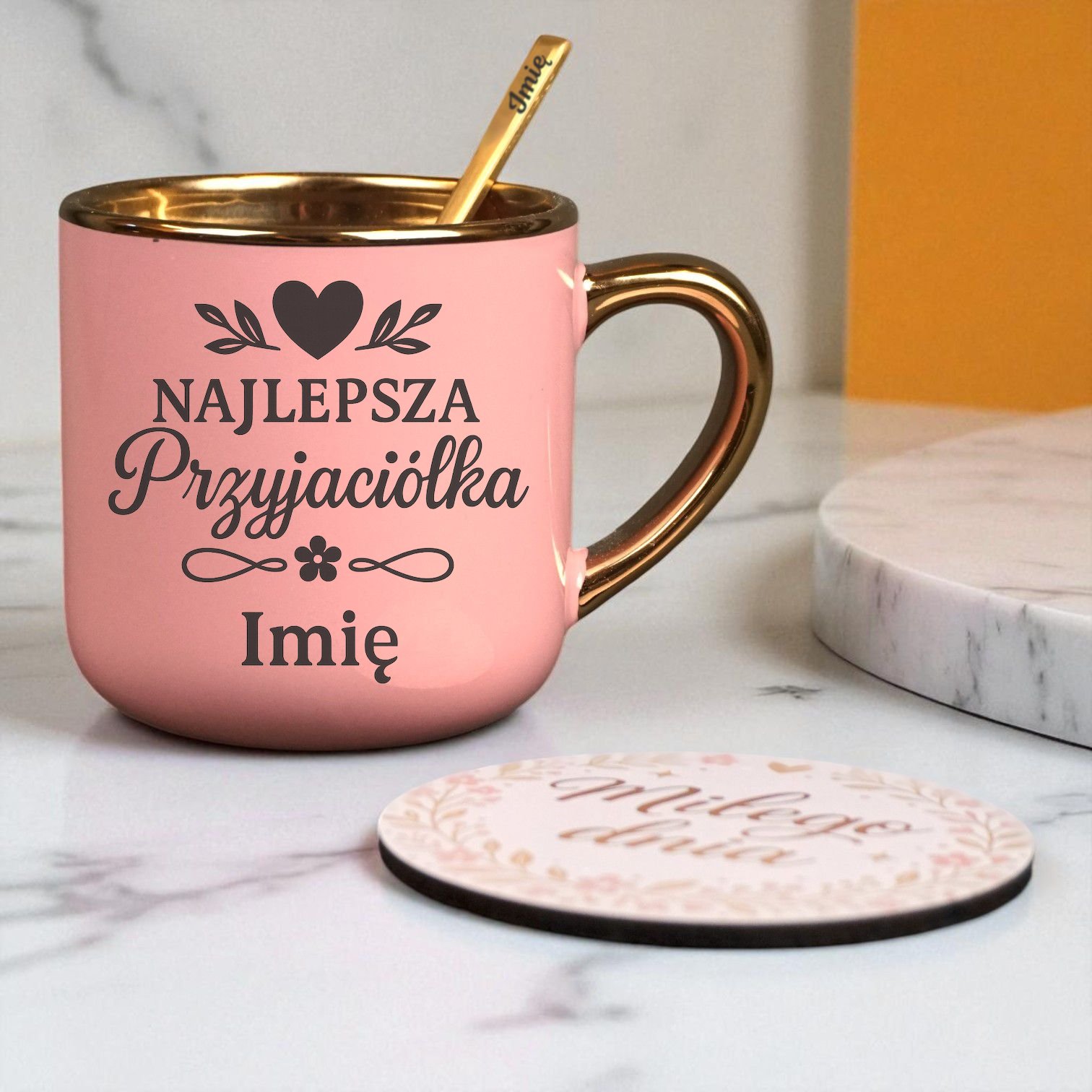 Kubek Personalizowany z Imieniem Róż + Łyżeczka i Podstawka Zestaw dla Przyjaciółki v.1