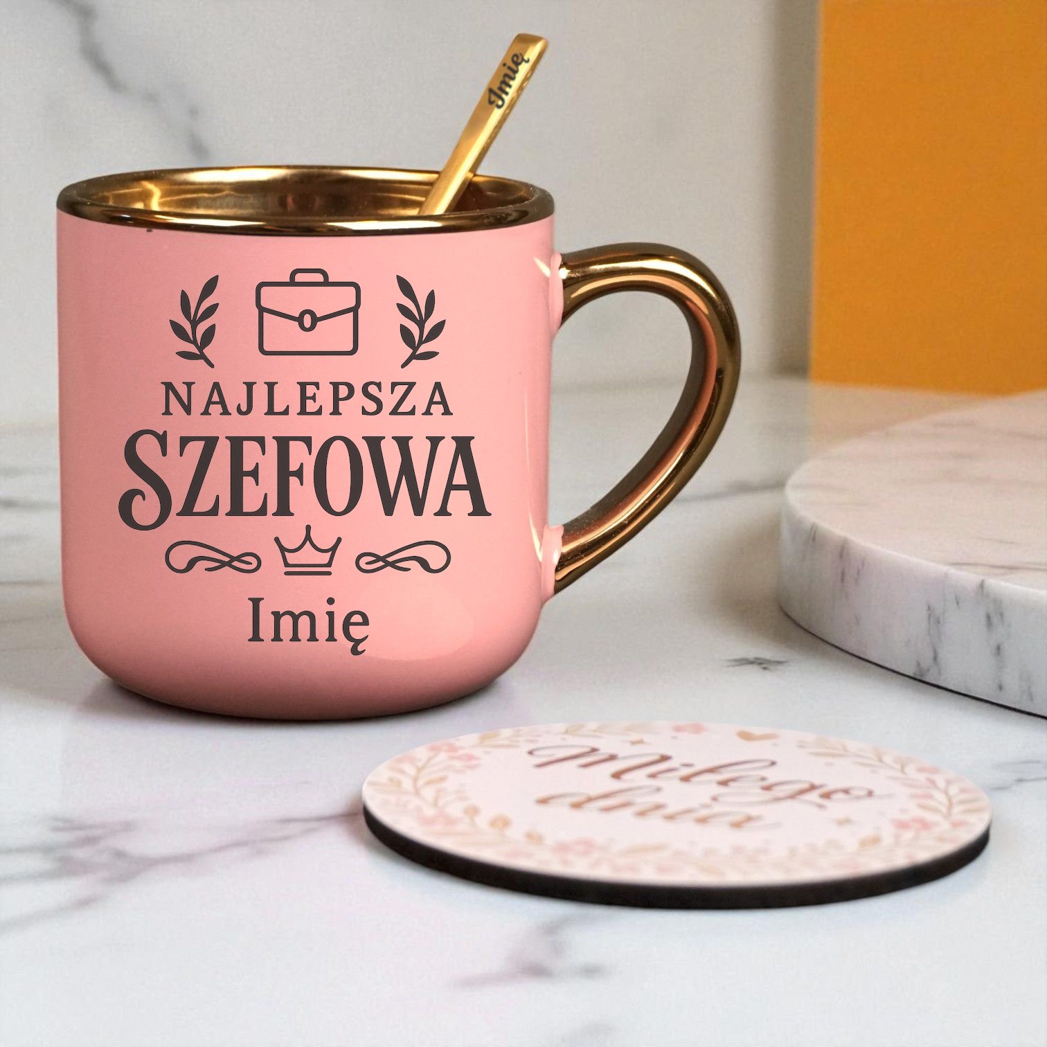 Kubek Personalizowany z Imieniem Róż + Łyżeczka i Podstawka Zestaw dla Szefowej v.1