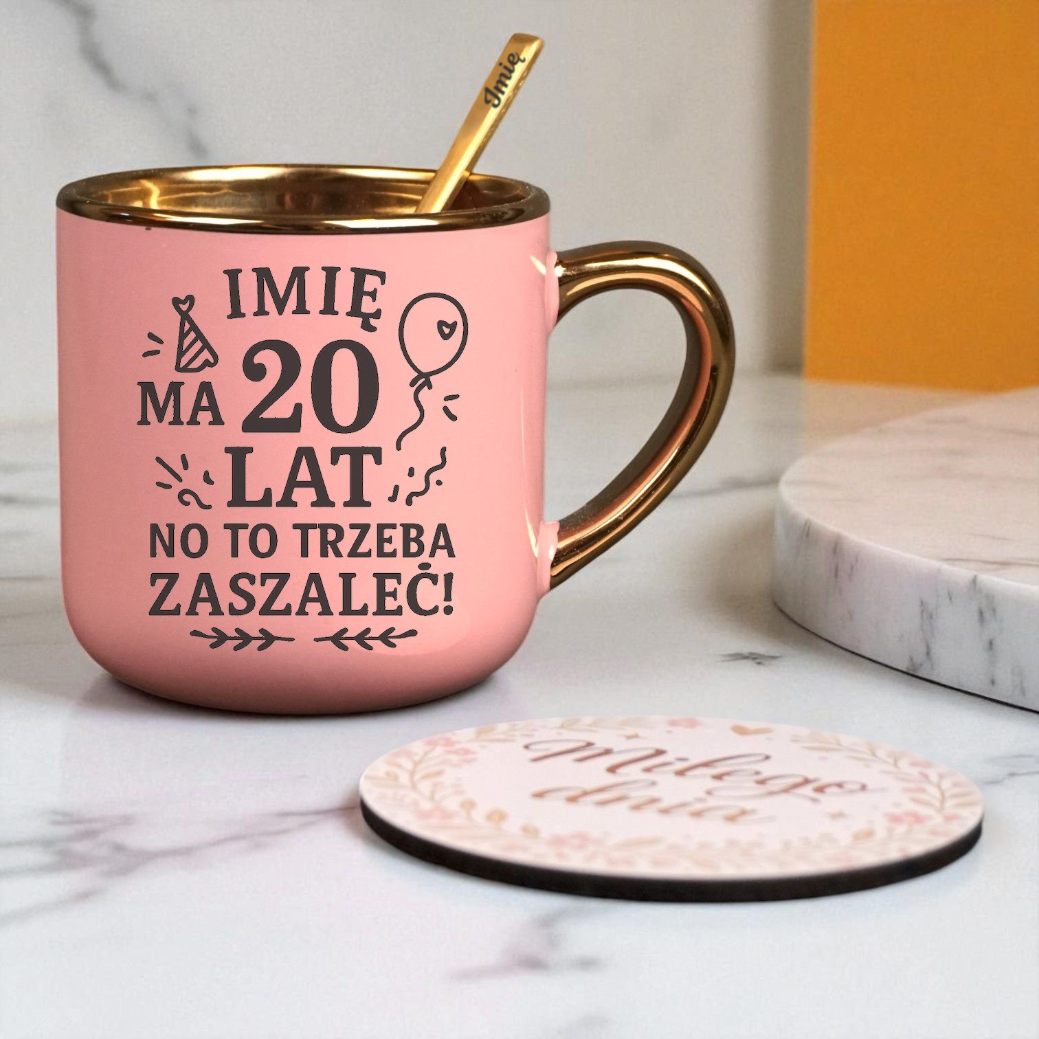 Kubek Personalizowany z Imieniem Róż + Łyżeczka i Podstawka Zestaw na 20 Urodziny v.3