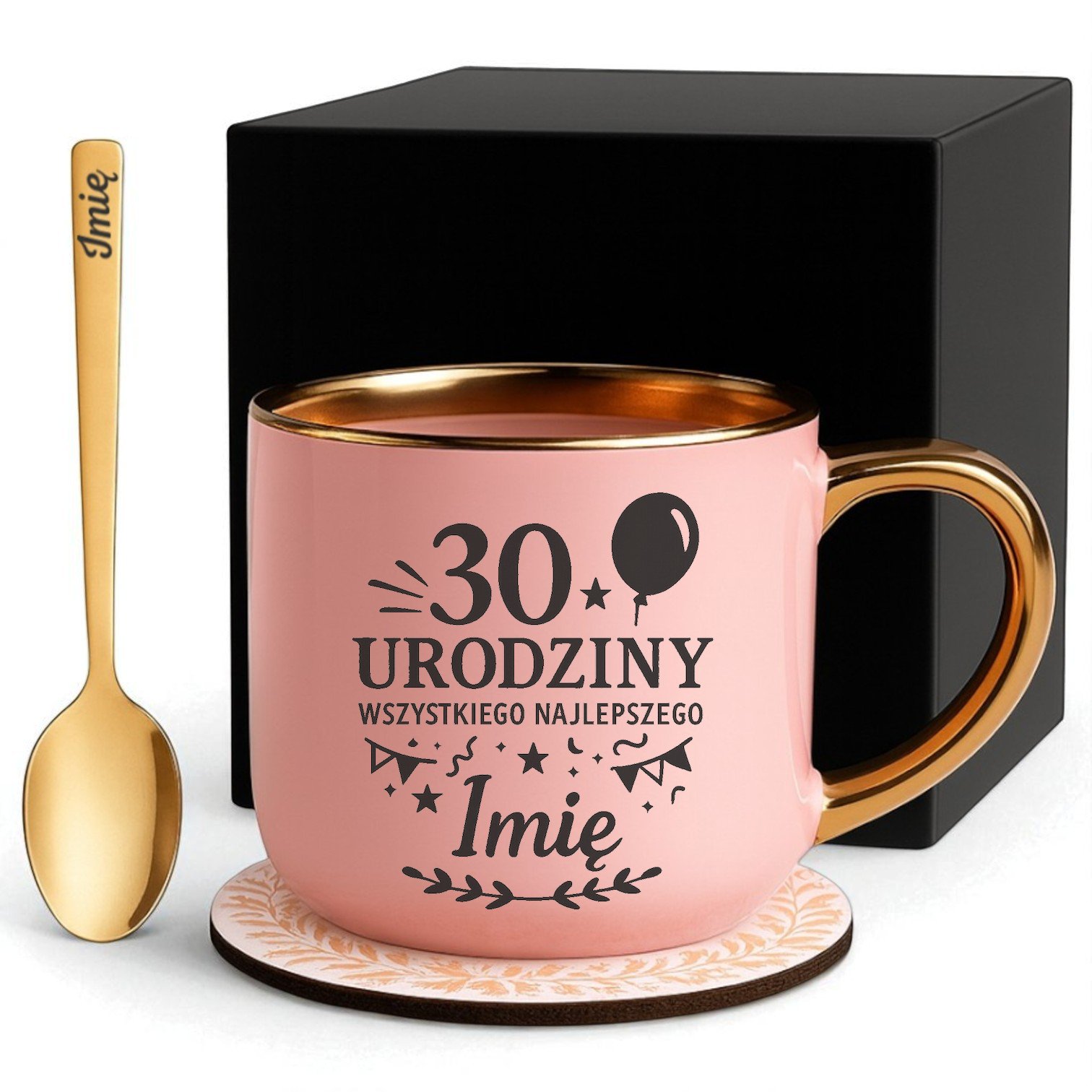 Kubek Personalizowany z Imieniem Róż + Łyżeczka i Podstawka Zestaw na 30 Urodziny v.6