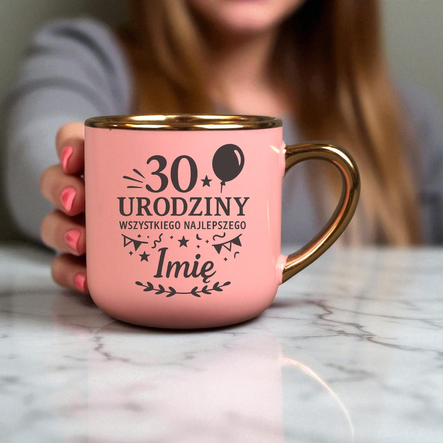 - Kubek: różowo-złoty, pojemność ok. 330 ml,, średnica 80mm, wysokość 95mm,personalizowany wzór z imieniem na jednej stronie kubka
