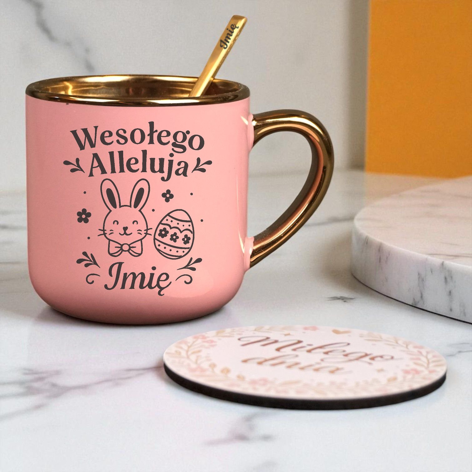 Kubek Personalizowany z Imieniem Róż + Łyżeczka i Podstawka Zestaw na Wielkanoc v.1