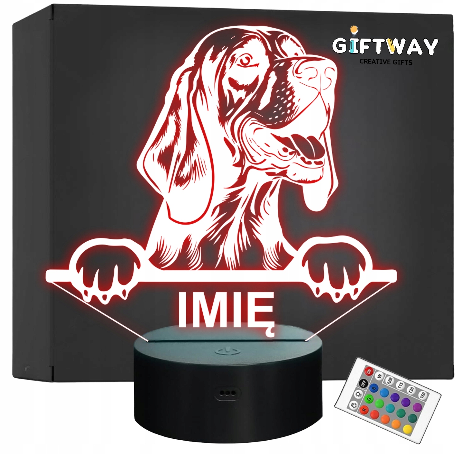 Nietypowa nocna lampka LED, która jest świetnym i kreatywnym pomysłem na prezent dla fana lub posiadacza psa rasy Bloodhound. Lampka przypomina iluzję, co daje świetny efekt wizualny oraz nadaje niepowtarzalnego klimatu, gdyż świeci w wielu kolorach i trybach!