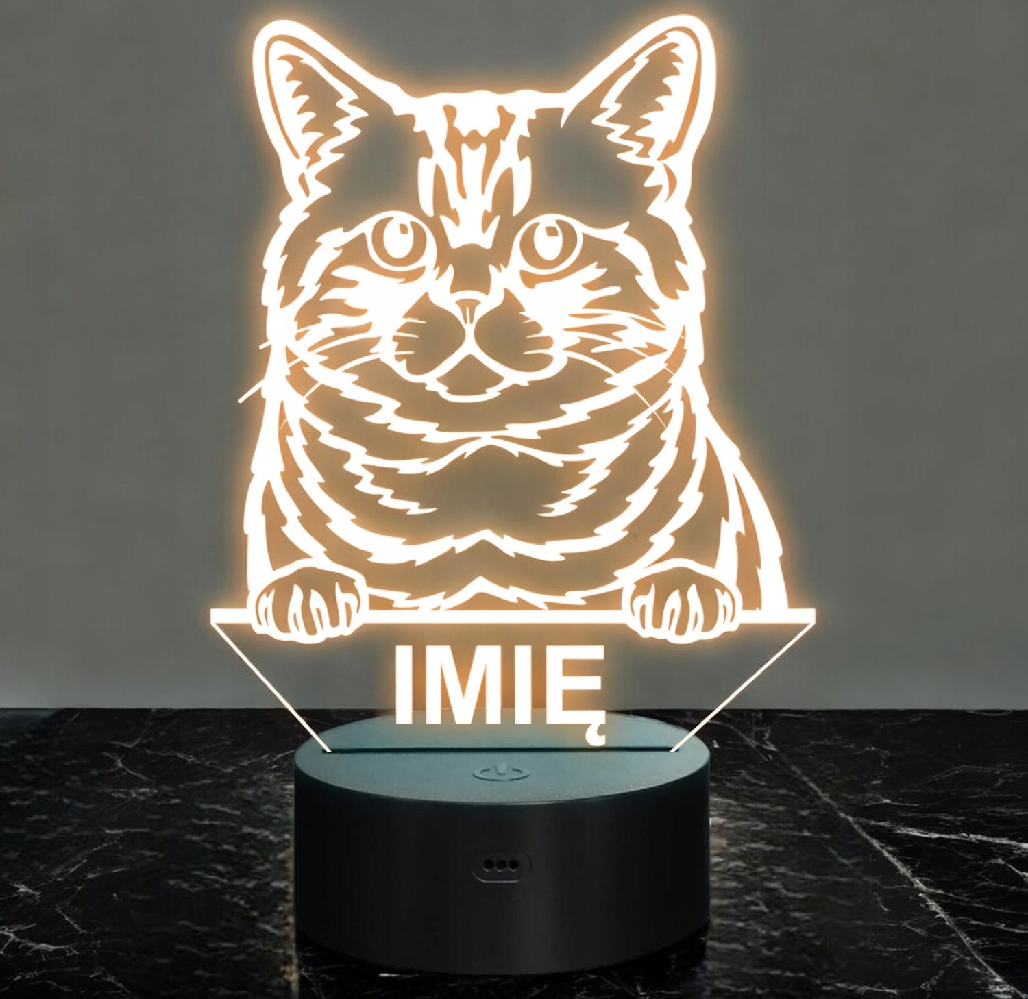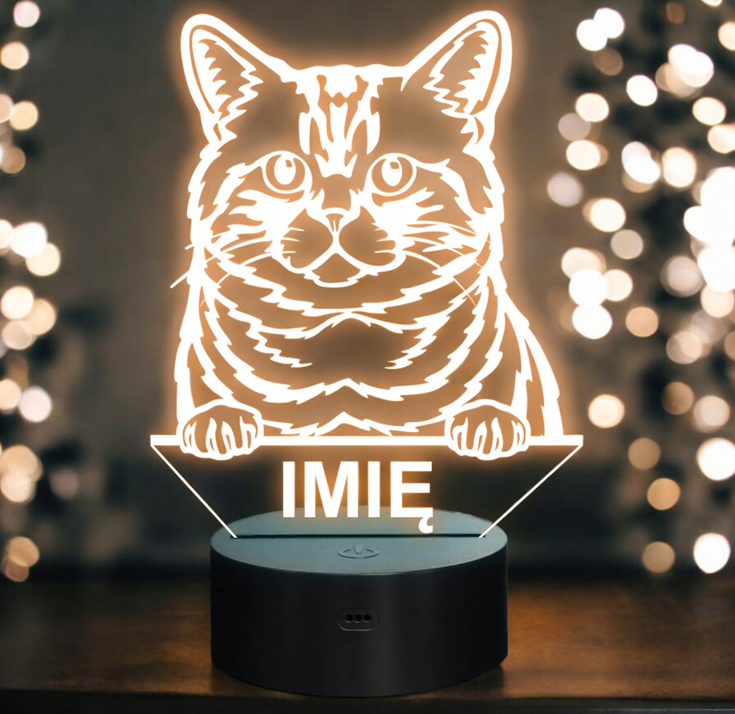 Nietypowa nocna lampka LED, która jest świetnym i kreatywnym pomysłem na prezent dla fana lub posiadacza kota rasy Brazilian Shorthair. Lampka przypomina iluzję, co daje świetny efekt wizualny oraz nadaje niepowtarzalnego klimatu, gdyż świeci w wielu kolorach i trybach!