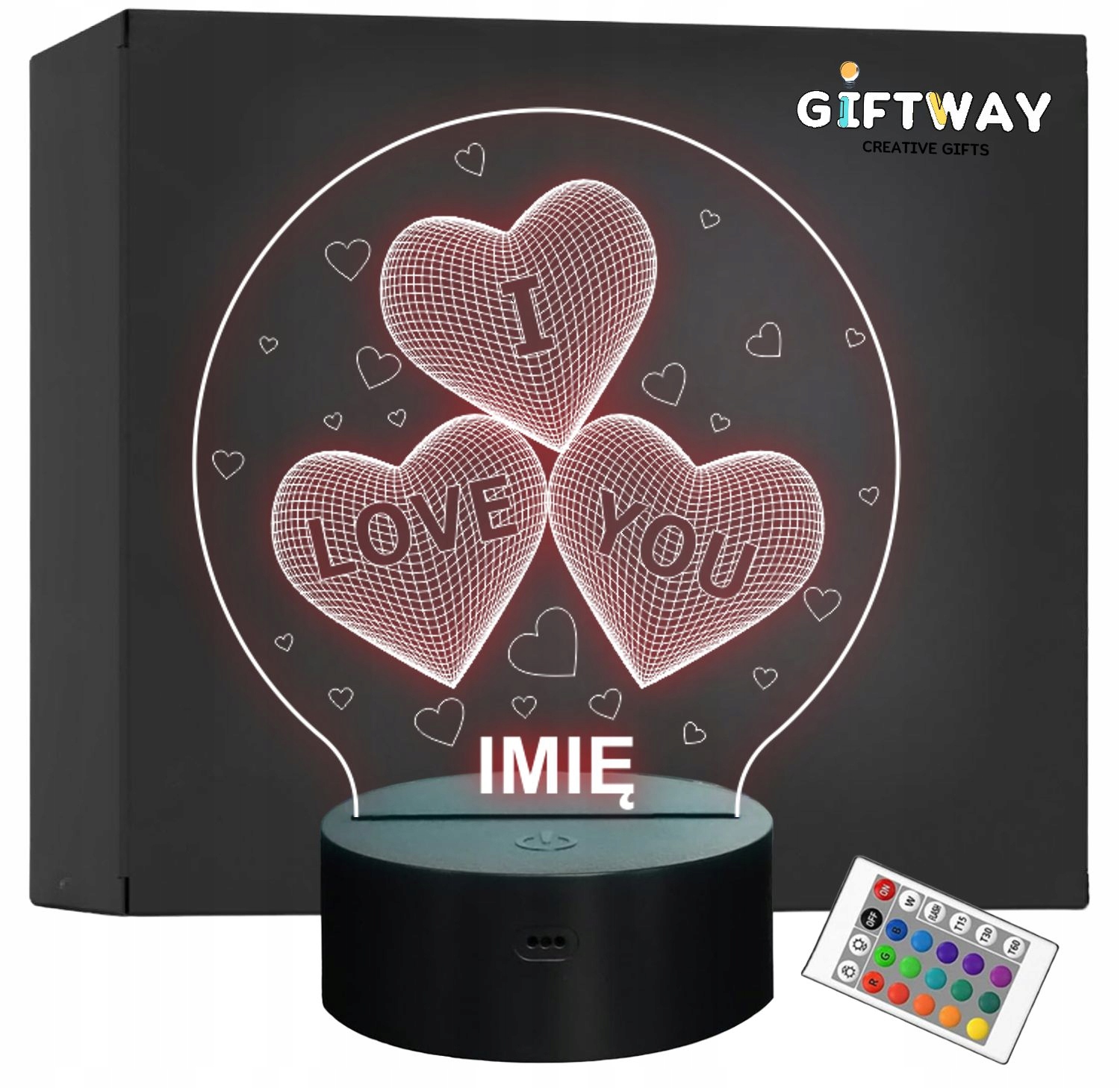 Nietypowa nocna lampka LED, która jest świetnym i kreatywnym pomysłem na prezent dla drugiej połowki. Ma kształt okręgu z małymi i dużymi sercami. Znajduje się na niej napis "I LOVE YOU", który jednoznacznie wyraża nasze uczucia. Lampka nadaje niepowtarzalnego klimatu, gdyż świeci w wielu kolorach!