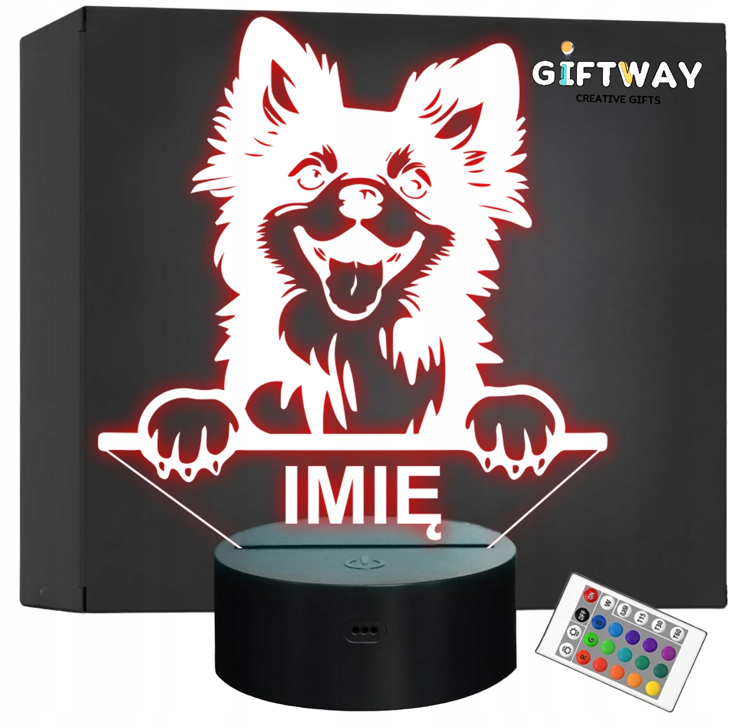 Nietypowa nocna lampka LED, która jest świetnym i kreatywnym pomysłem na prezent dla fana lub posiadacza psa rasy Keeshonden. Lampka przypomina iluzję, co daje świetny efekt wizualny oraz nadaje niepowtarzalnego klimatu, gdyż świeci w wielu kolorach i trybach!