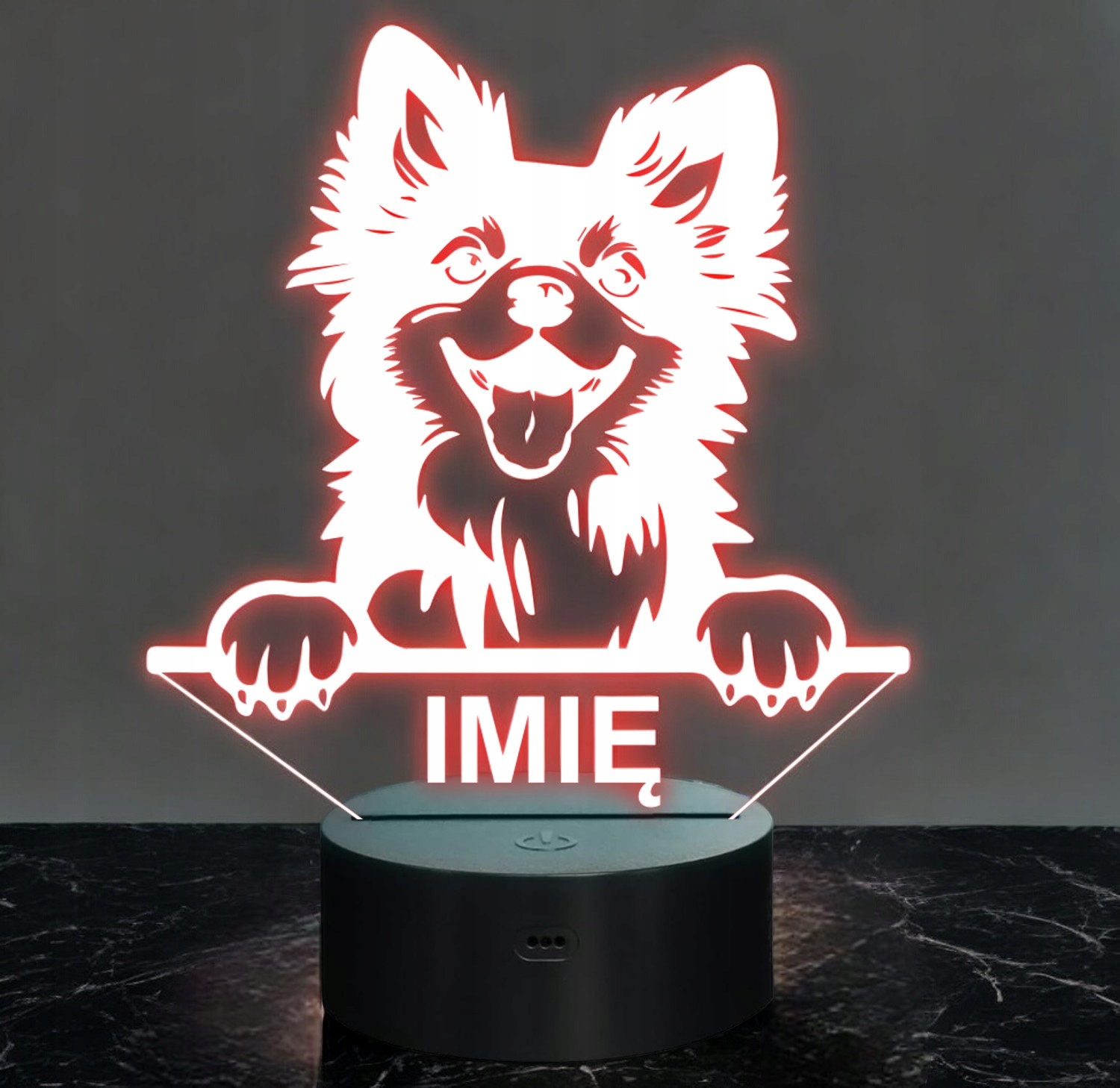 Nasza personalizowana lampka to idealny wybór dla fana lub posiadacza psa rasy Keeshonden. To również świetny pomysł na dekorację pokoju!