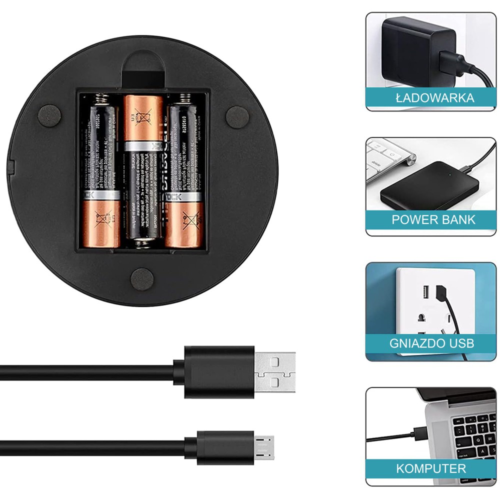 Lampka może być zasilana trzema bateriami AA (brak w zestawie) lub za pomocą kabla USB, który znajduje się w zestawie z lampką.