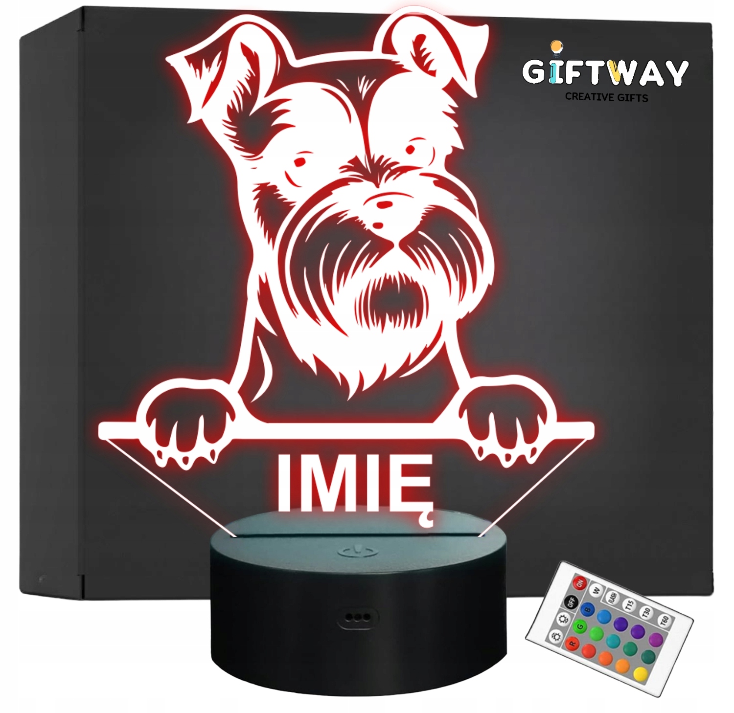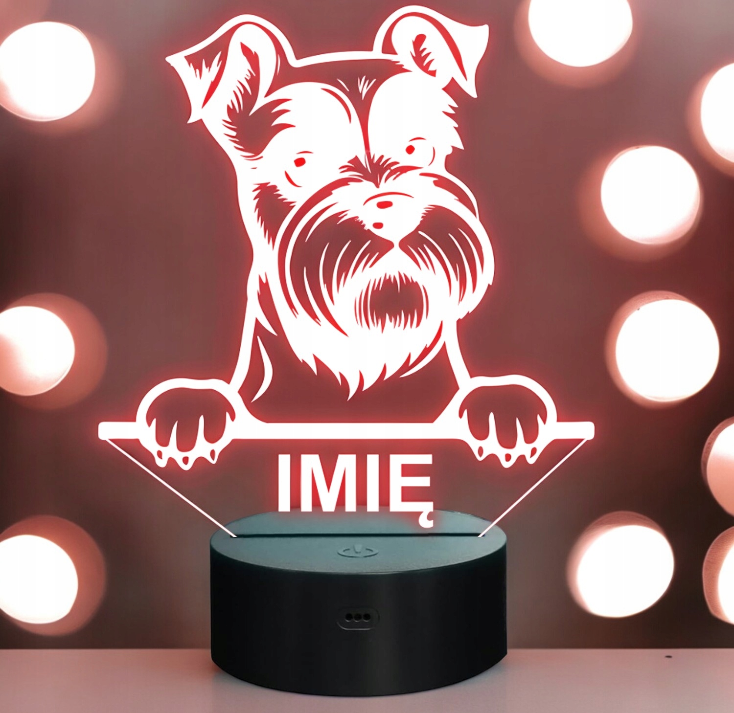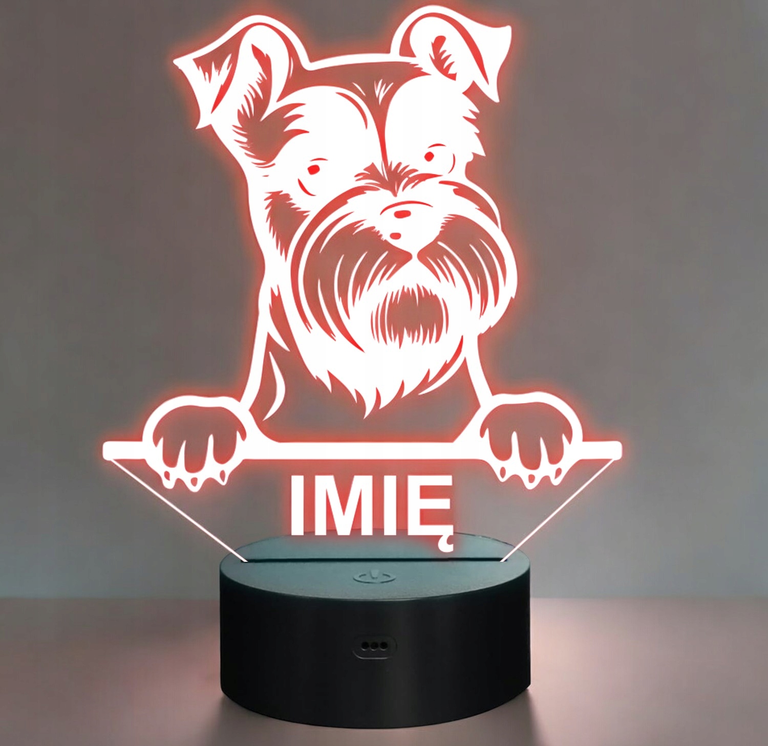 Nasza personalizowana lampka to idealny wybór dla fana lub posiadacza psa rasy Schnauzer. To również świetny pomysł na dekorację pokoju!