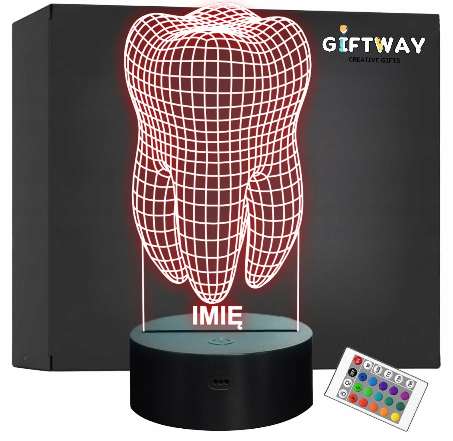 Nietypowa nocna lampka LED, która jest świetnym i kreatywnym pomysłem na prezent dla osoby powiązanej z branżą dentystyczną, bądź jako dekoracja pokoju dziecka. Ma kształt zęba który ma efekt iluzji 3D. Lampka nadaje niepowtarzalnego klimatu, gdyż świeci w wielu kolorach!