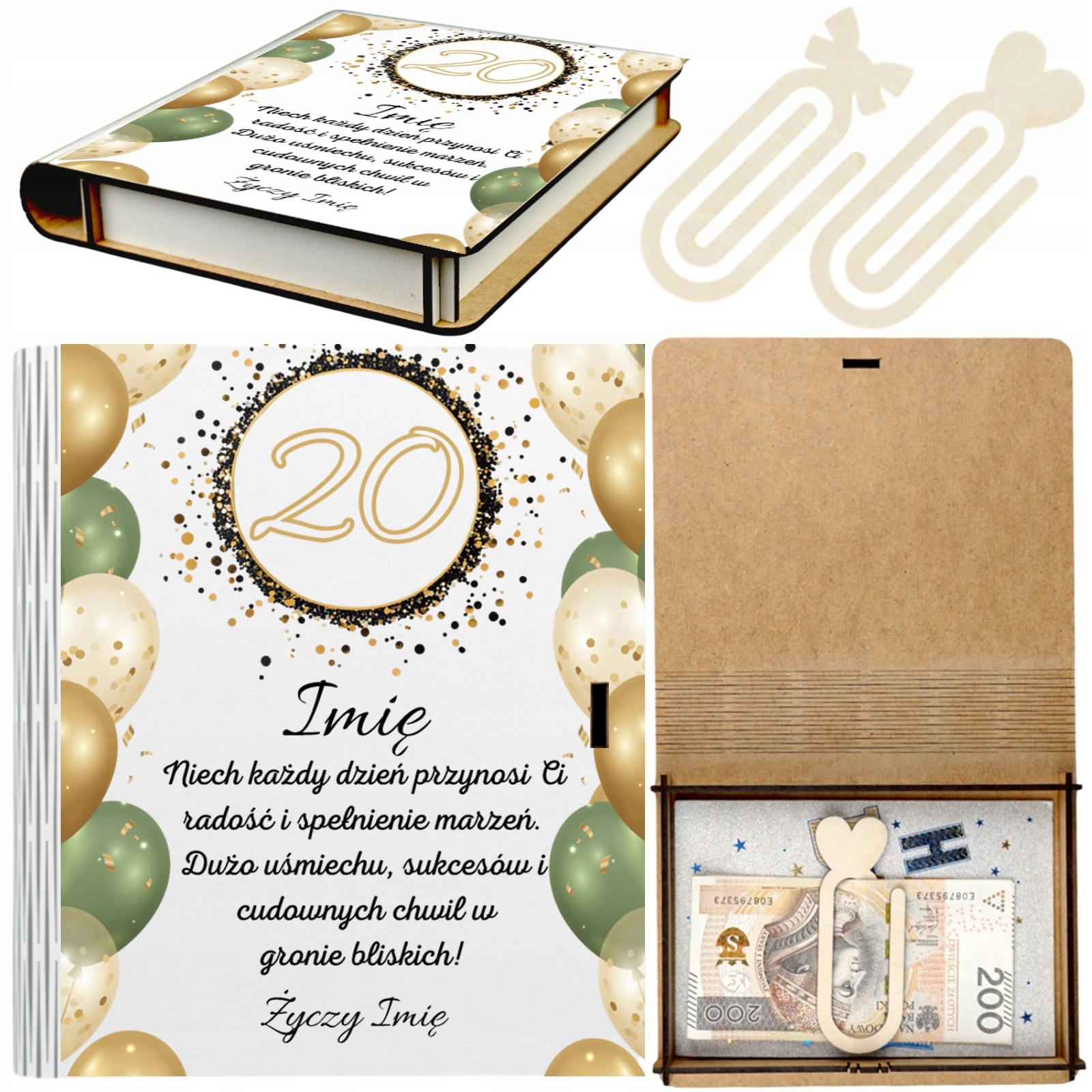 Drewniane Pudełko na Pieniądze – 20 Urodziny + Spinki na Banknoty