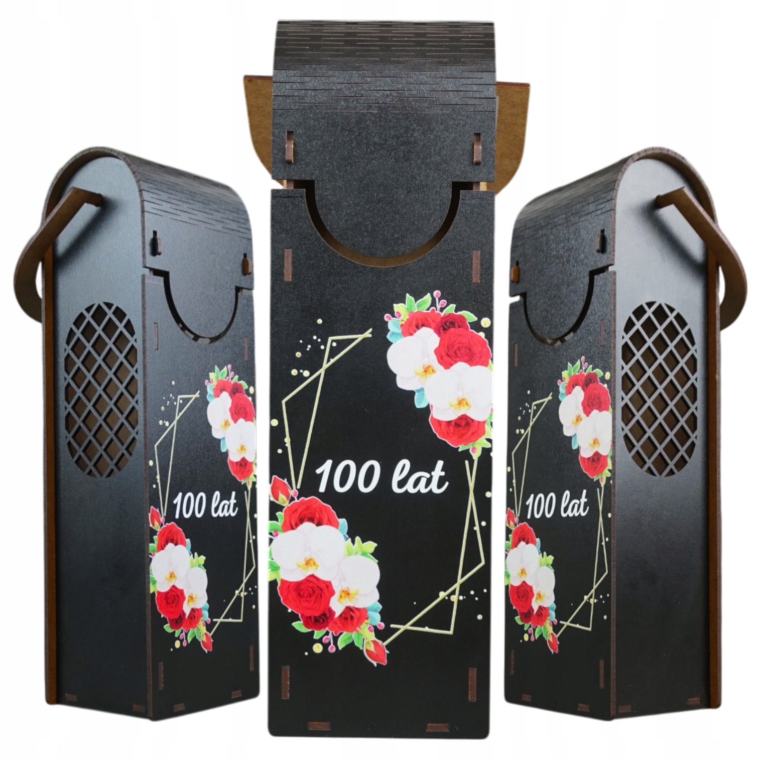 Na froncie pudełka znajduje się stylowy wzór geometrycznej ramki z kwiatami oraz napisem 100 lat, który w połączneniu z czarnym kolorem ścianek pudełka tworzy unikalną kompozycję.