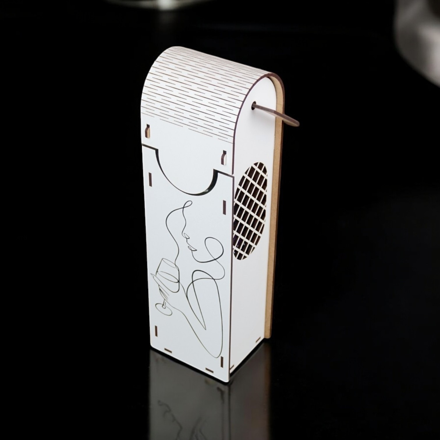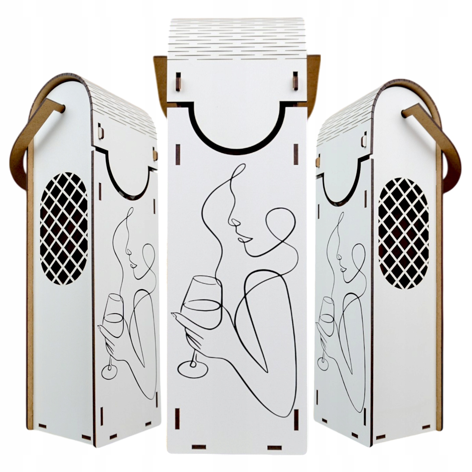 Na froncie pudełka znajduje się stylowy wzór lineart kobiety z lampką wina, który w połączneniu z białym kolorem ścianek pudełka tworzy unikalną kompozycję.