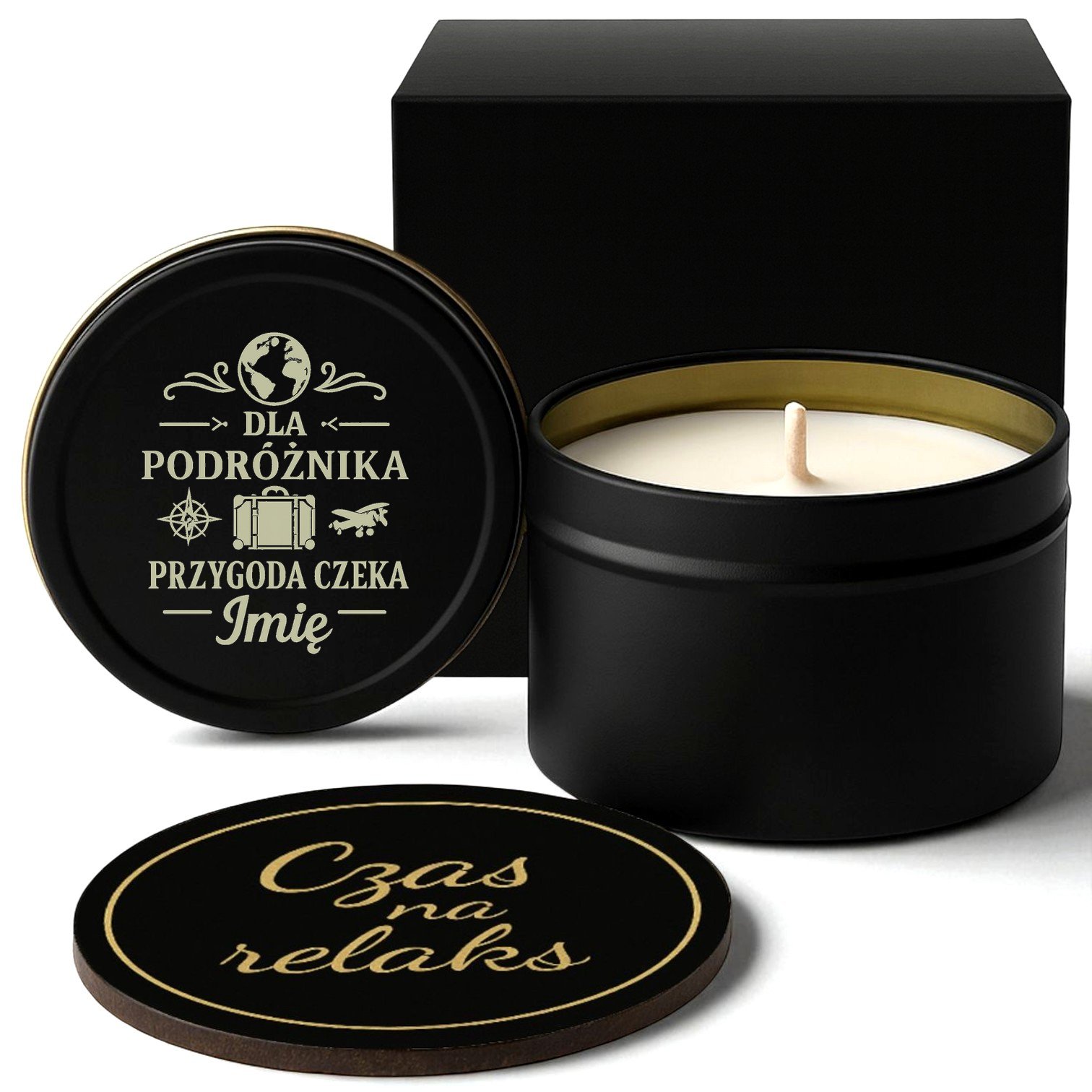 Personalizowana sojowa świeca zapachowa w czarnej puszce ze stylową podkładką „Czas na relaks”
