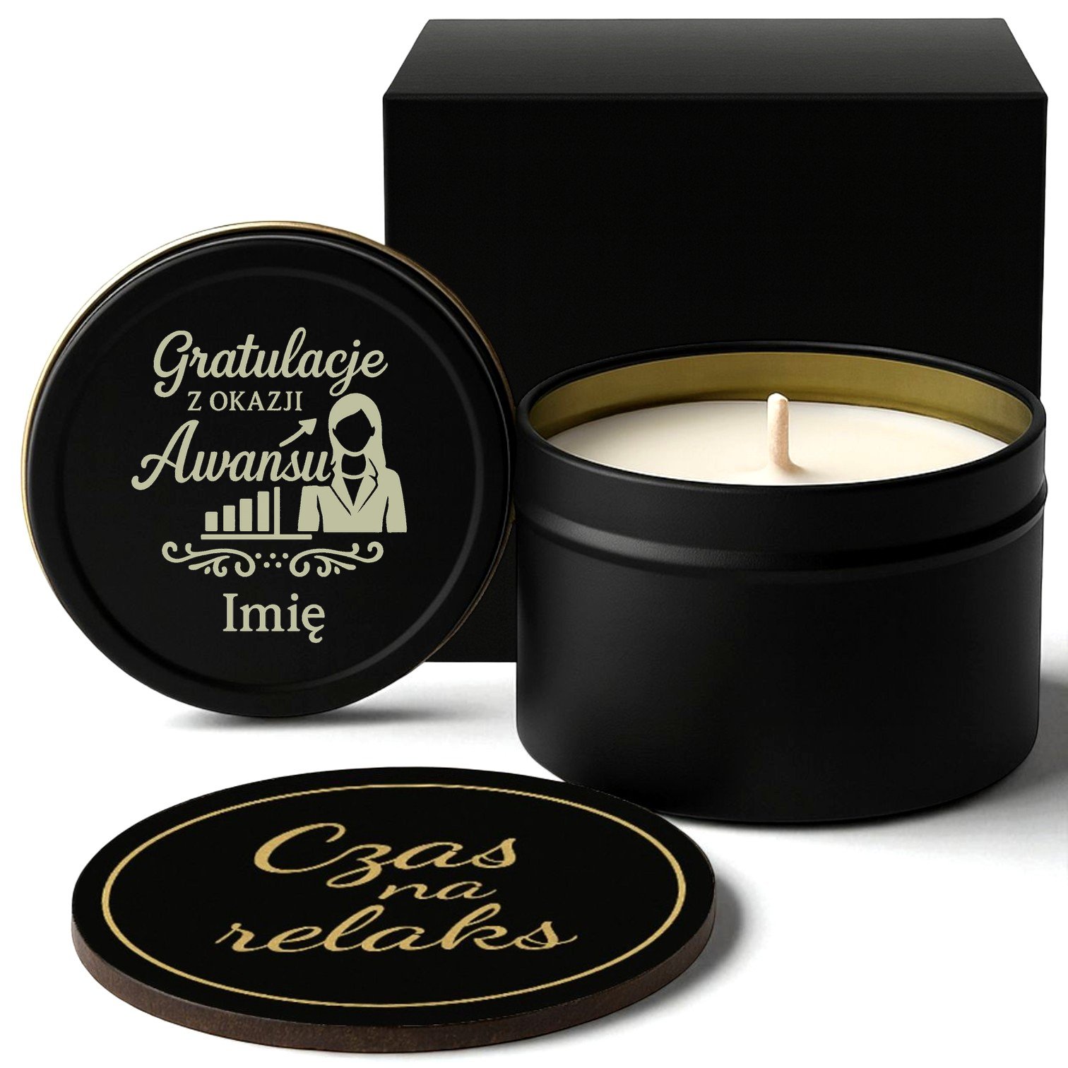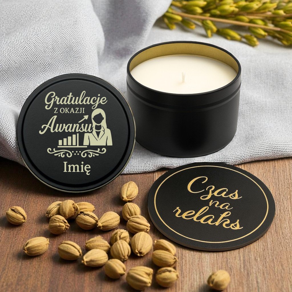 Personalizowana sojowa świeca zapachowa w czarnej puszce ze stylową podkładką „Czas na relaks”