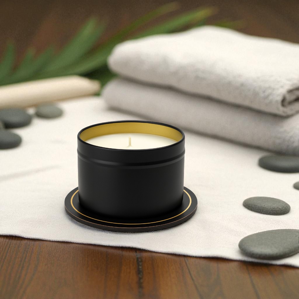 Personalizowana sojowa świeca zapachowa w czarnej puszce ze stylową podkładką „Czas na relaks”